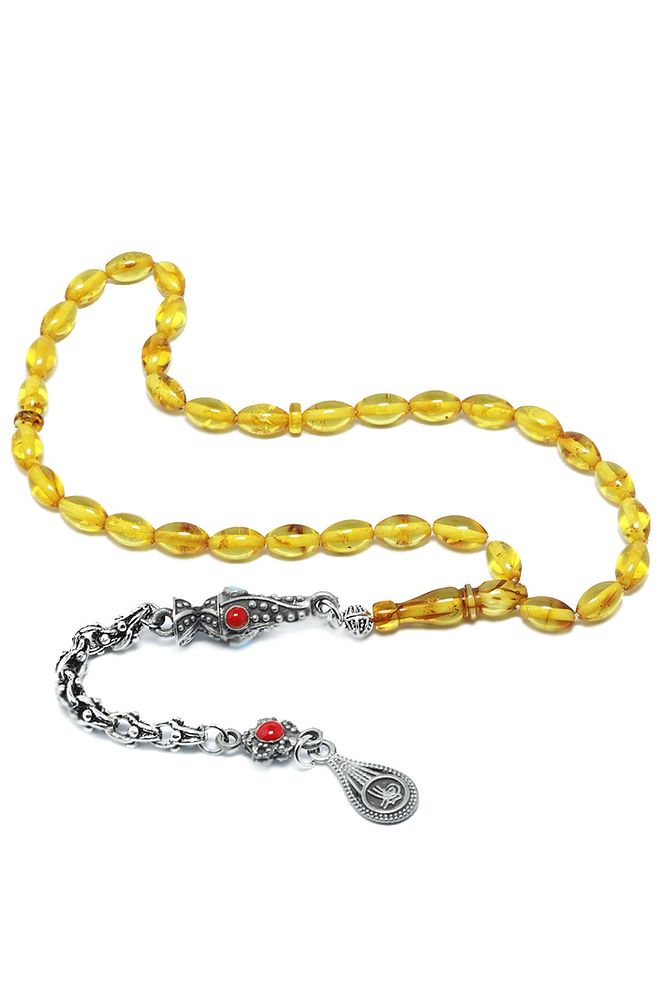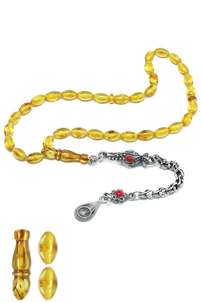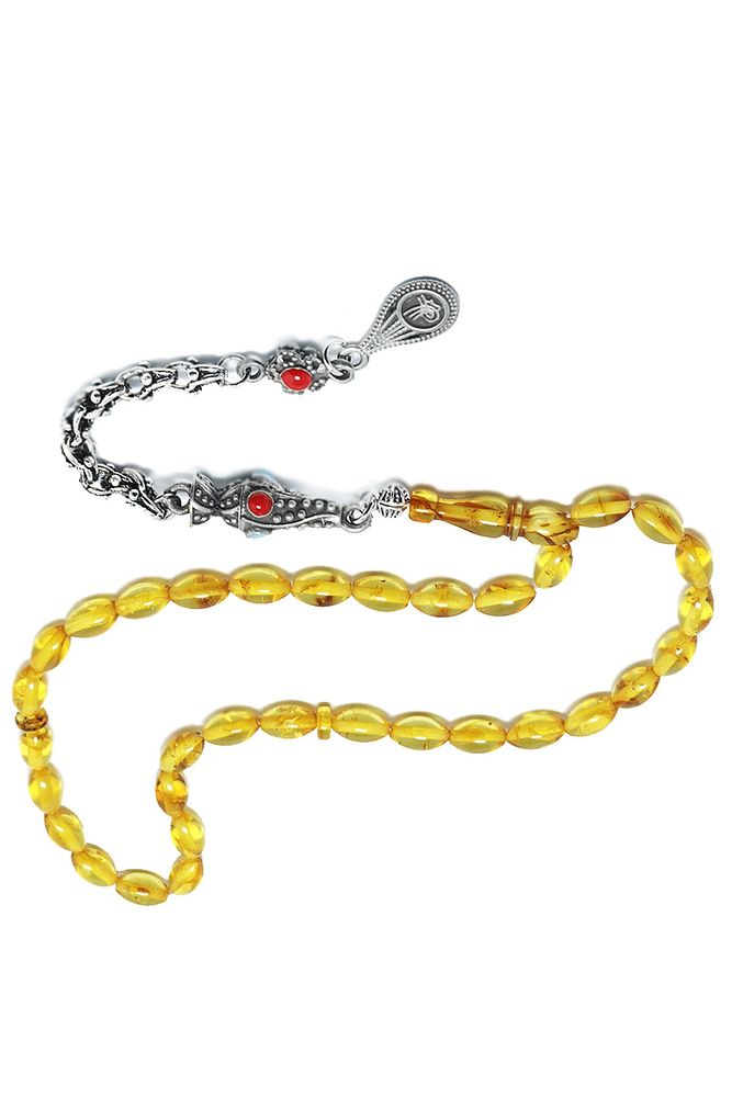 ; Ürün ya da Doğal Taş Açıklaması; ; (Doğal Sakinleştirici, Astım, Guatr ve Ağrı Kesici Taşı); ; Doğal damla kehribar tesbih modelleri, ''Tesbih Atölyesi'' Atölyelerinde ustalarımız tarafından kuru torna işciliği ile elde özen ile tane tane işlenmektedir. Ürünlerimiz el işciliği olduğu için sınırlı sayıda üretilmektedir. Üzerine üç kat el cilası atılmıştır. Kehribar çam ağacının fosilleşmiş reçinesidir. Baltık ülkelerinden en kaliteli kehribar kütlelerini ithal etmekteyiz. Damla kehribar tesbih Buram buram çam kokulu ürünlerimiz %100 doğal, garantili ve sertifikalıdır. Ürünlerimiz fabrikasyon olmadığı için kehribar tanelerinin hiç biri birbirinin aynısı olmadığı için küçükte olsa farklılıklar olabilir.; ; Bu tasarımda; Kesme kesim renk almış damla kehribar taşı kullanılmıştır. Püskül yapımında; Renk atmaz, kararmaz, matlaşmaz düşük ayar gümüş kullanılmıştır.; ; Üretildiği Taş; Kehribar Taşı; Renk; Doğal Renk; Ağırlık; 5.2 gr; Tane Şekli; 5x9.4 mm; Tane Ölçüsü; Arpa Kesim; Toplam Uzunluk; 20-30 cm; Püskül Maddesi; Düşük Ayar Gümüş;