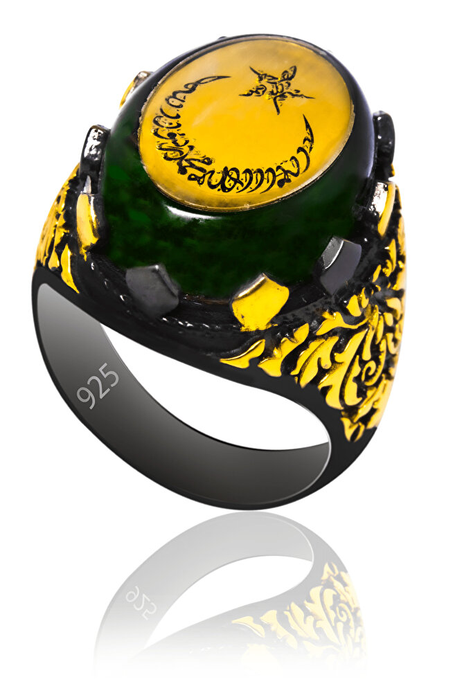 Bu tasarımda; Ay Yıldız İşlemeli Yeşil Kehribar Taşı kullanılmıştır. Kasadaki desenler oyma el sanatı ile yapılmaktadır. Erkek gümüş yüzüklerimizin ölçüsünü parmağınıza göre çevrenizdeki sarrafiye ve gümüşcülere çok cüzzi 3 ile 5 TL yaptırabilirsiniz. Ürünlerimiz standart ölçü gönderilmektedir. Bu işlemi yaklaşık 5 dakika içerisinde yaptırabilirsiniz.