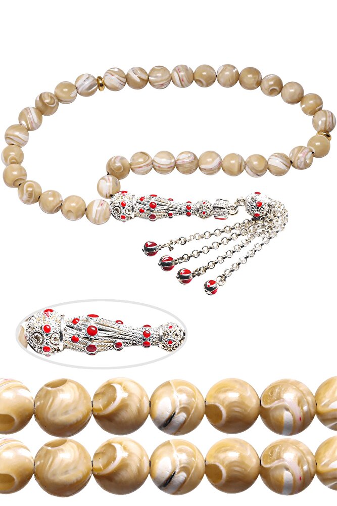 Beyaz Kırmızı Mineli Telkari Püsküllü Doğal Damarlı Sedef Tesbih