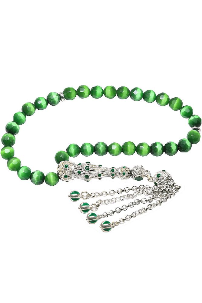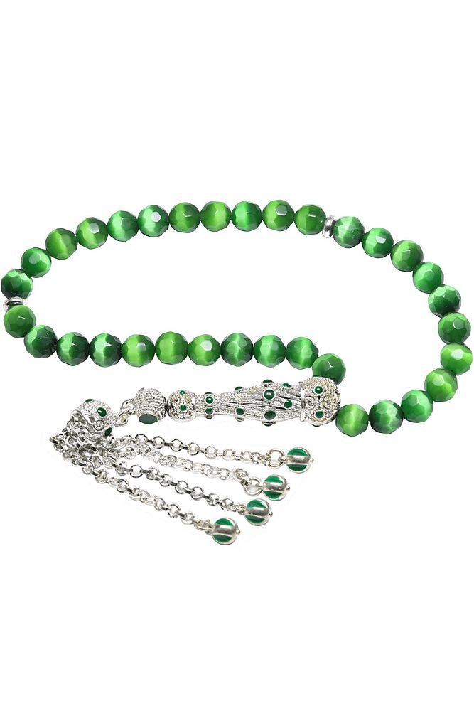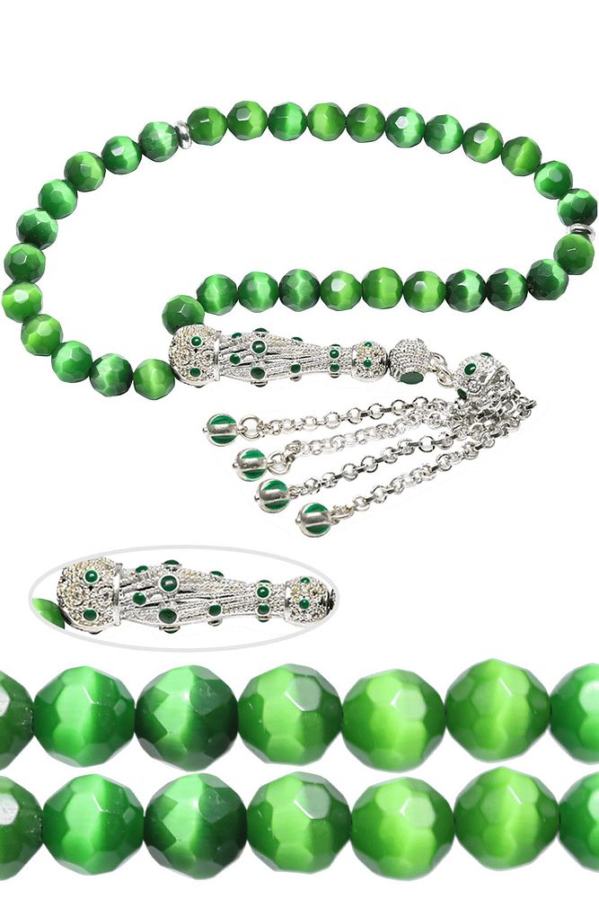 Beyaz Yeşil Mineli Telkari Püskül Doğal Yeşil Kedi Gözü Taşı Tesbih
