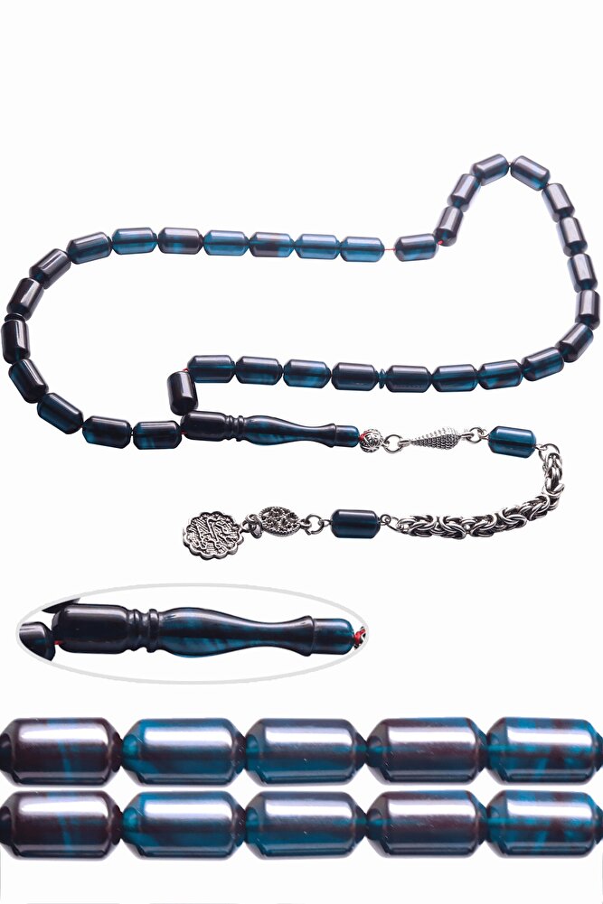 Ürün ya da Doğal Taş Açıklaması (Ağrı Kesici, Sinir Stres ve Bereket Taşı) Ateş kehribar tesbih modelleri, \'\'Tesbih Atölyesi\'\' Atölyelerinde ustalarımız tarafından kuru torna işciliği ile elde özen ile tane tane işlenmektedir. Ürünlerimiz el işciliği olduğu için sınırlı sayıda üretilmektedir. Tasarımlarımızda kullandığımız reçineler Dünya\'nın en kaliteli reçineleridir. Kısa bir süre içerisinde renk alır ve koku verir. Ürünleriniz orijinallik ve garanti belgesi ile gönderilir. Tasarımlarımıza üç kat cila atılmıştır. Muhteşem bir çekime sahip koleksiyonluk ve günlük çekim için ideal ürünlerdir. Bu tasarımda; Dışı siyah renkli içi mavi renkli özel 1.sınıf çift renk alan ve koku veren kaliteli ateş kehribar reçine kullanılmıştır. Her kehribar tanesi birbirinin aynısı olmadığı için küçükte olsa farklılıklar gösterebilir. Üretildiği Malzeme; Ateş Kehribar; Ana Renk; Dışı Siyah İçi Mavi Renk; Ağırlık; 20-30 gr; Tane Şekli; 8x12 mm; Tane Ölçüsü; Kapsül Kesim; Toplam Uzunluk; 20-30 cm; İmame ve Püskül Maddesi; Düşük Ayar Gümüş;