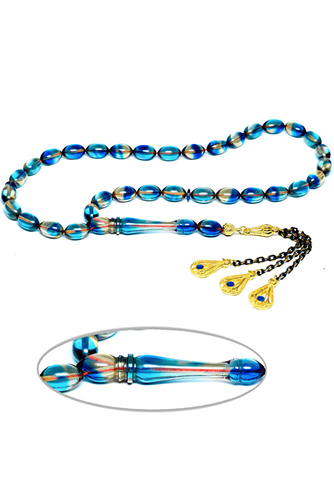 Üretildiği Malzeme : Ateş Kehribar Ana Renk : Gece Mavisi Renk Ağırlık : 20-30 gr Tane Şekli : 7x11 mm Tane Ölçüsü : Beyzi Kesim Toplam Uzunluk : 20-30 cm İmame ve Püskül Maddesi : Düşük Ayar Gümüş