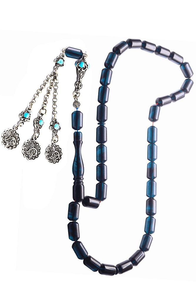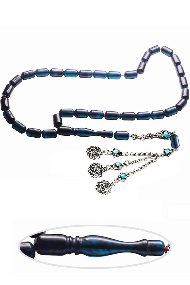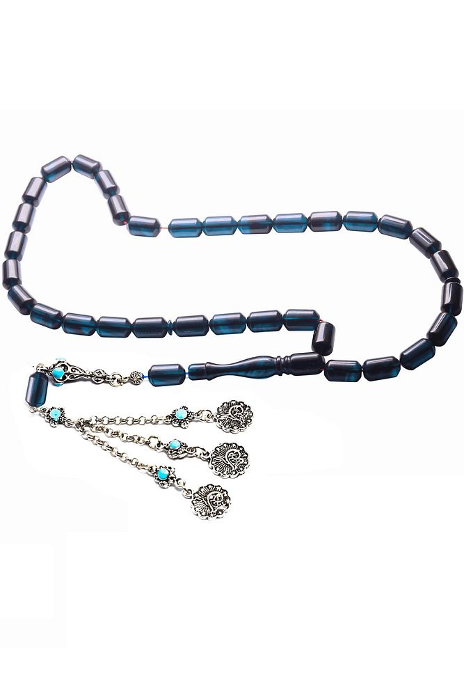Halep Püsküllü Kapsül Kesim Dışı Siyah Içi Mavi Ateş Kehribar Tesbih