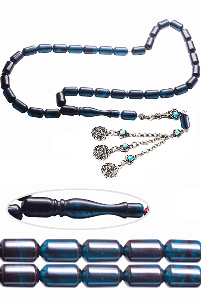 Ürün ya da Doğal Taş Açıklaması (Ağrı Kesici, Sinir Stres ve Bereket Taşı) Ateş kehribar tesbih modelleri, \'\'Tesbih Atölyesi\'\' Atölyelerinde ustalarımız tarafından kuru torna işciliği ile elde özen ile tane tane işlenmektedir. Ürünlerimiz el işciliği olduğu için sınırlı sayıda üretilmektedir. Tasarımlarımızda kullandığımız reçineler Dünya\'nın en kaliteli reçineleridir. Kısa bir süre içerisinde renk alır ve koku verir. Ürünleriniz orijinallik ve garanti belgesi ile gönderilir. Tasarımlarımıza üç kat cila atılmıştır. Muhteşem bir çekime sahip koleksiyonluk ve günlük çekim için ideal ürünlerdir. Bu tasarımda; Dışı siyah içi zümrüt yeşili renkli özel kalıptan renk alan ve koku veren kaliteli ateş kehribar reçine kullanılmıştır. Her kehribar tanesi birbirinin aynısı olmadığı için küçükte olsa farklılıklar gösterebilir. Üretildiği Malzeme; Ateş Kehribar; Ana Renk; Dışı Siyah İçi Yeşil; Ağırlık; 20-30 gr; Tane Şekli; 7.5x11.5 mm; Tane Ölçüsü; Beyzi Kesim; Toplam Uzunluk; 20-30 cm; İmame ve Püskül Maddesi; Sistemli;