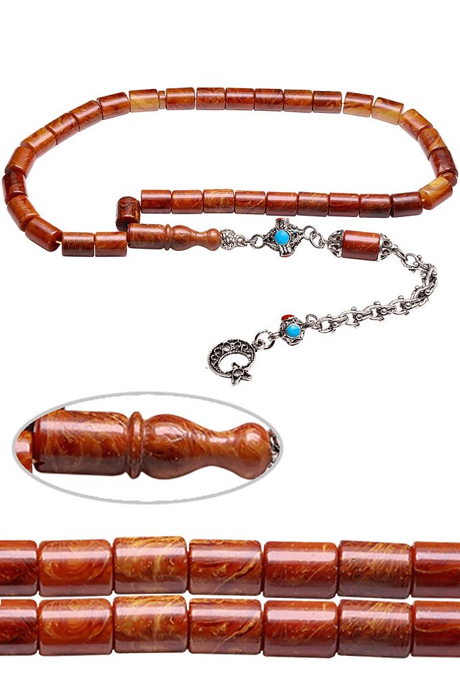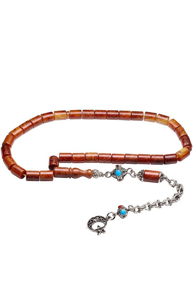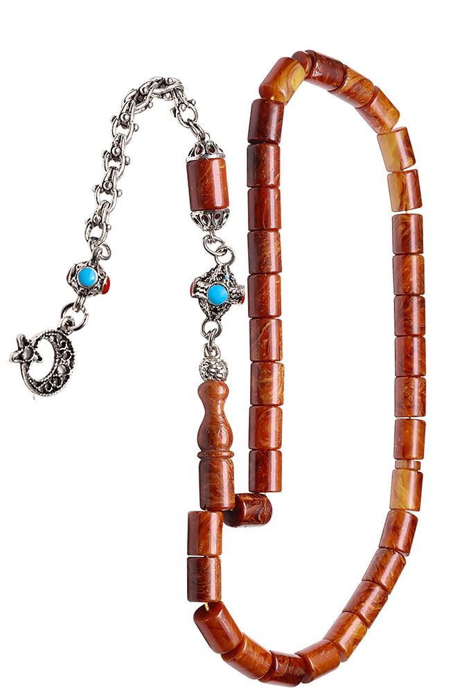 (Ağrı Kesici, Sinir Stres ve Bereket Taşı) Ateş kehribar tesbih modelleri, ''Tesbih Atölyesi'' Atölyelerinde ustalarımız tarafından kuru torna işciliği ile elde özen ile tane tane işlenmektedir. Ürünlerimiz el işciliği olduğu için sınırlı sayıda üretilmektedir. Tasarımlarımızda kullandığımız reçineler Dünya'nın en kaliteli reçineleridir. Kısa bir süre içerisinde renk alır ve koku verir. Ürünleriniz orijinallik ve garanti belgesi ile gönderilir. Tasarımlarımıza üç kat cila atılmıştır. Muhteşem bir çekime sahip koleksiyonluk ve günlük çekim için ideal ürünlerdir. Bu tasarımda; Mavi şeffaf renk yoğun hareli renk alan ve koku veren kaliteli ateş kehribar reçine kullanılmıştır. Her kehribar tanesi birbirinin aynısı olmadığı için küçükte olsa farklılıklar gösterebilir. ; Üretildiği Malzeme; Ateş Kehribar; Ana Renk; Mavi Şeffaf Renk; Ağırlık; 20-30 gr; Tane Şekli; 8x12 mm; Tane Ölçüsü; Kapsül Kesim; Toplam Uzunluk; 20-30 cm; İmame ve Püskül Maddesi; Sistemli;
