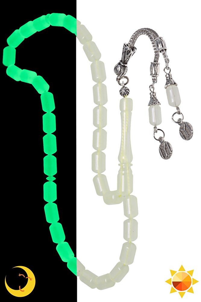 (Karanlıkta Fosforlu Parlayan Kedi Gözü) Kedi gözü tesbih modelleri, ''Tesbih Atölyesi'' Atölyelerinde ustalarımız tarafından kuru torna işciliği ile elde özen ile tane tane işlenmektedir. Ürünlerimiz el işciliği olduğu için sınırlı sayıda üretilmektedir. Tasarımlarımızda kullandığımız taşlar Dünya'nın en kaliteli taşlarını ithal etmekteyiz. Bu tasarımda; ''Işık ile enerji olan karanlıkta fosforlu parlayan kapsül kesim kedi gözü kullanılmıştır.'Çift kaplama rodaj sistemi uygulandığı için renk atmaz ve kararmaz bir yapıya sahiptir. Üretildiği Taş; Kedi Gözü; Ana Renk; Yeşil Renk Alır; Ağırlık; 20-30 gr; Tane Şekli; 7x11 mm; Tane Ölçüsü; Kapsül Kesim; Toplam Uzunluk; 20-30 cm; İmame ve Püskül Maddesi; Düşük Ayar Gümüş;