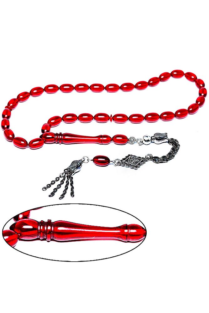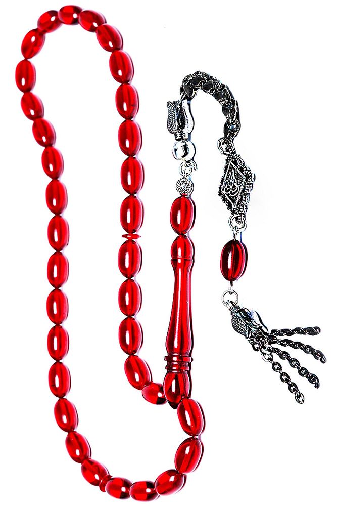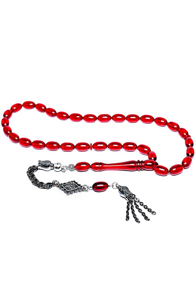 Ürün ya da Doğal Taş Açıklaması (Ağrı Kesici, Sinir Stres ve Bereket Taşı) Ateş kehribar tesbih modelleri, ''Tesbih Atölyesi'' Atölyelerinde ustalarımız tarafından kuru torna işciliği ile elde özen ile tane tane işlenmektedir. Ürünlerimiz el işciliği olduğu için sınırlı sayıda üretilmektedir. Tasarımlarımızda kullandığımız reçineler Dünya'nın en kaliteli reçineleridir. Kısa bir süre içerisinde renk alır ve koku verir. Ürünleriniz orijinallik ve garanti belgesi ile gönderilir. Tasarımlarımıza üç kat cila atılmıştır. Muhteşem bir çekime sahip koleksiyonluk ve günlük çekim için ideal ürünlerdir. Bu tasarımda; Şeffaf kırmızı özel muhteşem parlak renk alan kaliteli ateş kehribar reçine kullanılmıştır. Her kehribar tanesi birbirinin aynısı olmadığı için küçükte olsa farklılıklar gösterebilir. Üretildiği Malzeme; Ateş Kehribar; Ana Renk; Kırmızı Renk; Ağırlık; 20-30 gr; Tane Şekli; 7x11 mm; Tane Ölçüsü; Beyzi Kesim; Toplam Uzunluk; 20-30 cm; İmame ve Püskül Maddesi; Düşük Ayar Gümüş;