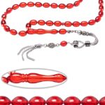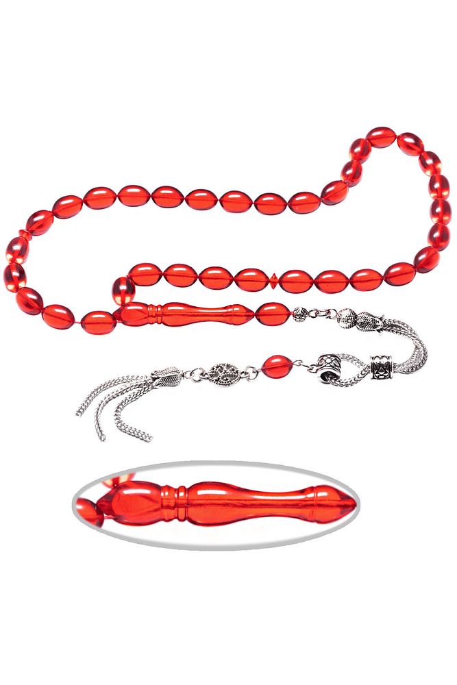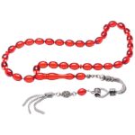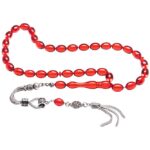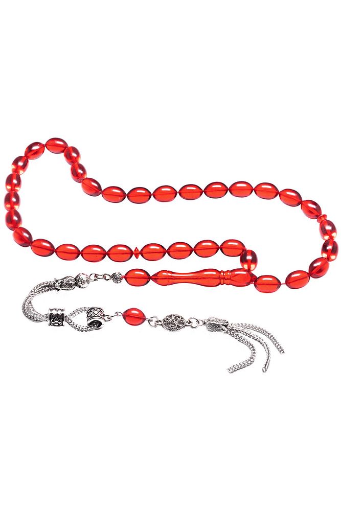 (Ağrı Kesici, Sinir Stres ve Bereket Taşı); ; Ateş kehribar tesbih modelleri, ”Tesbih Atölyesi” Atölyelerinde ustalarımız tarafından kuru torna işciliği ile elde özen ile tane tane işlenmektedir. Ürünlerimiz el işciliği olduğu için sınırlı sayıda üretilmektedir. Tasarımlarımızda kullandığımız reçineler Dünya’nın en kaliteli reçineleridir. Kısa bir süre içerisinde renk alır ve koku verir. Ürünleriniz orijinallik ve garanti belgesi ile gönderilir. Tasarımlarımıza üç kat cila atılmıştır. Muhteşem bir çekime sahip koleksiyonluk ve günlük çekim için ideal ürünlerdir.; Bu tasarımda; Bayrak kırmızı renkli ultra parlak çok kısa sürede renk alan ve koku veren kaliteli ateş kehribar reçine kullanılmıştır. Her kehribar tanesi birbirinin aynısı olmadığı için küçükte olsa farklılıklar gösterebilir.; ; Üretildiği Malzeme; Ateş Kehribar; Ana Renk; Bayrak Kırmızı Renk; Ağırlık; 20-30 gr; Tane Şekli; 8×11.5 mm; Tane Ölçüsü; Beyzi Kesim; Toplam Uzunluk; 20-30 cm; İmame ve Püskül Maddesi; Düşük Ayar Gümüş;
