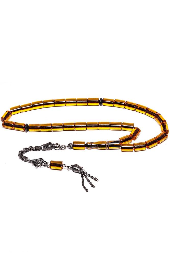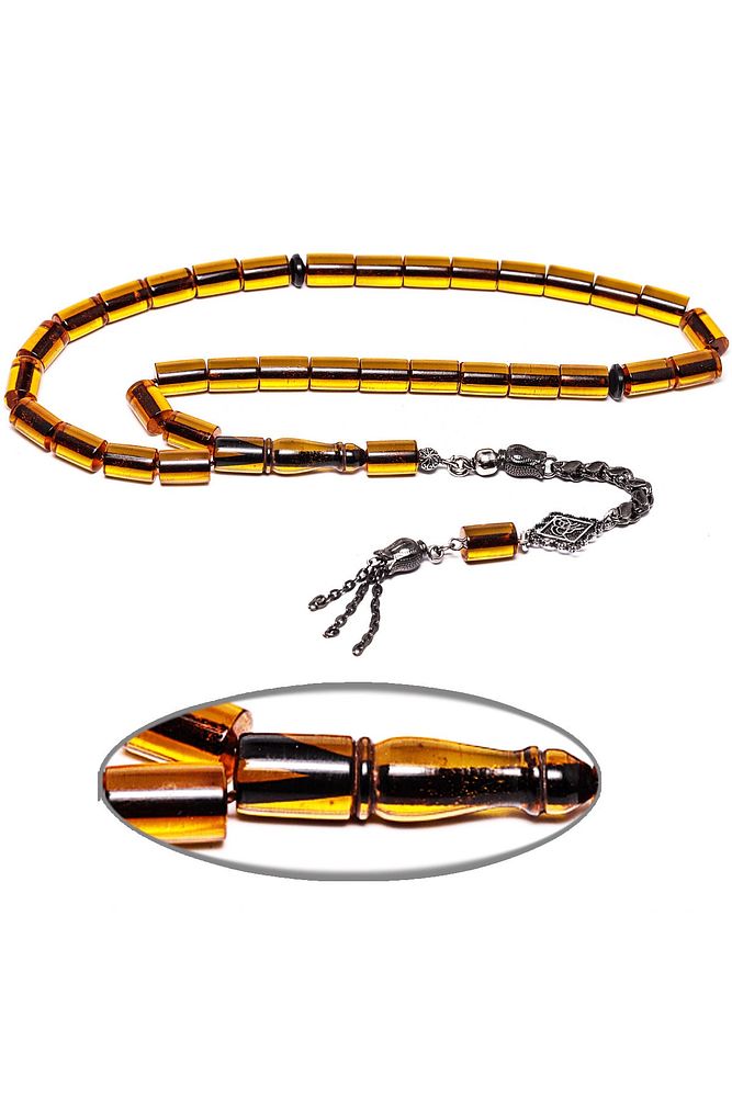 (Ağrı Kesici, Sinir Stres ve Bereket Taşı); Ateş kehribar tesbih modelleri, ''Tesbih Atölyesi'' Atölyelerinde ustalarımız tarafından kuru torna işciliği ile elde özen ile tane tane işlenmektedir. Ürünlerimiz el işciliği olduğu için sınırlı sayıda üretilmektedir. Tasarımlarımızda kullandığımız reçineler Dünya'nın en kaliteli reçineleridir. Kısa bir süre içerisinde renk alır ve koku verir. Ürünleriniz orijinallik ve garanti belgesi ile gönderilir. Tasarımlarımıza üç kat cila atılmıştır. Muhteşem bir çekime sahip koleksiyonluk ve günlük çekim için ideal ürünlerdir.; Bu tasarımda; Koyu sarı renkli şeffaf delim renk alan ve koku veren kaliteli ateş kehribar reçine kullanılmıştır. Her kehribar tanesi birbirinin aynısı olmadığı için küçükte olsa farklılıklar gösterebilir.; Üretildiği Malzeme; Ateş Kehribar; Ana Renk; Koyu Bal Sarısı Renk; Ağırlık; 20-30 gr; Tane Şekli; 7.5x10 mm; Tane Ölçüsü; Kesme Kesim; Toplam Uzunluk; 20-30 cm; İmame ve Püskül Maddesi; Düşük Ayar Gümüş;