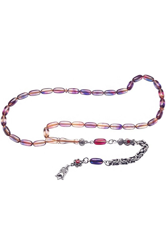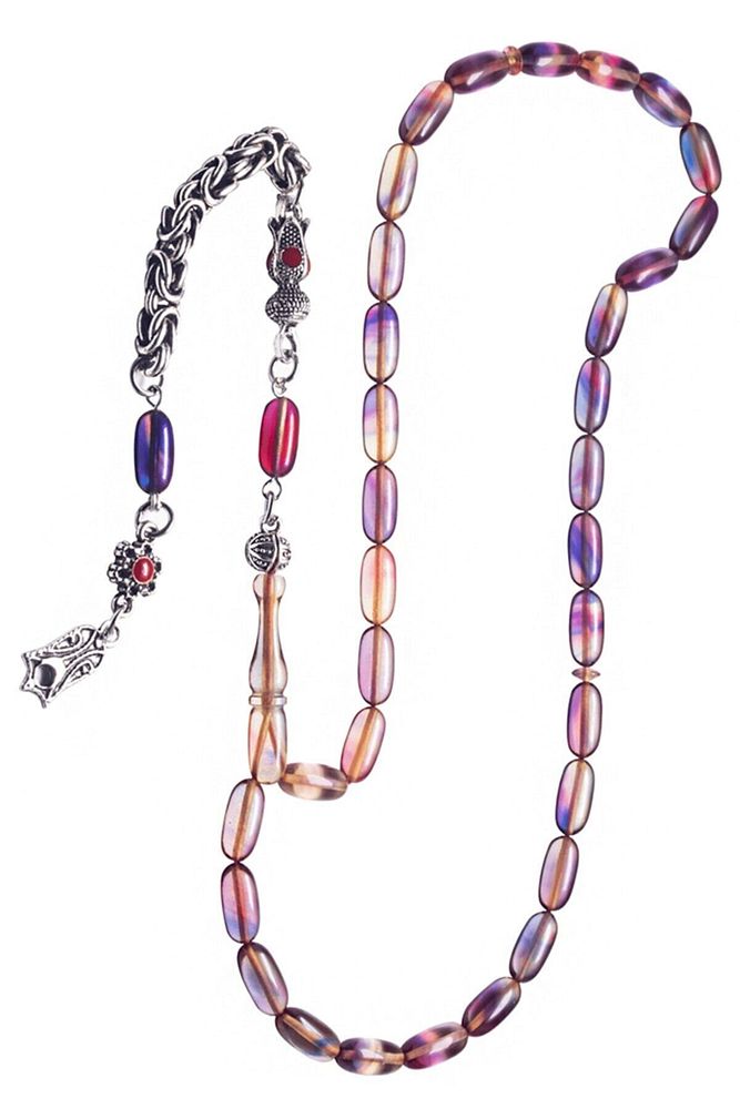 (Ağrı Kesici, Sinir Stres ve Bereket Taşı); ; Ateş kehribar tesbih modelleri, \'\'Tesbih Atölyesi\'\' Atölyelerinde ustalarımız tarafından kuru torna işciliği ile elde özen ile tane tane işlenmektedir. Ürünlerimiz el işciliği olduğu için sınırlı sayıda üretilmektedir. Tasarımlarımızda kullandığımız reçineler Dünya\'nın en kaliteli reçineleridir. Kısa bir süre içerisinde renk alır ve koku verir. Ürünleriniz orijinallik ve garanti belgesi ile gönderilir. Tasarımlarımıza üç kat cila atılmıştır. Muhteşem bir çekime sahip koleksiyonluk ve günlük çekim için ideal ürünlerdir.; ; Bu tasarımda; Mavi ve mor renkli özel 1.sınıf şeffaf renk alan ve koku veren kaliteli ateş kehribar reçine kullanılmıştır. Her kehribar tanesi birbirinin aynısı olmadığı için küçükte olsa farklılıklar gösterebilir.; ; Üretildiği Malzeme; Ateş Kehribar; Ana Renk; Mavi Mor Renk; Ağırlık; 20-30 gr; Tane Şekli; 5.5x11 mm; Tane Ölçüsü; Aspirin Kapsül Kesim; Toplam Uzunluk; 20-30 cm; İmame ve Püskül Maddesi; Düşük Ayar Gümüş;
