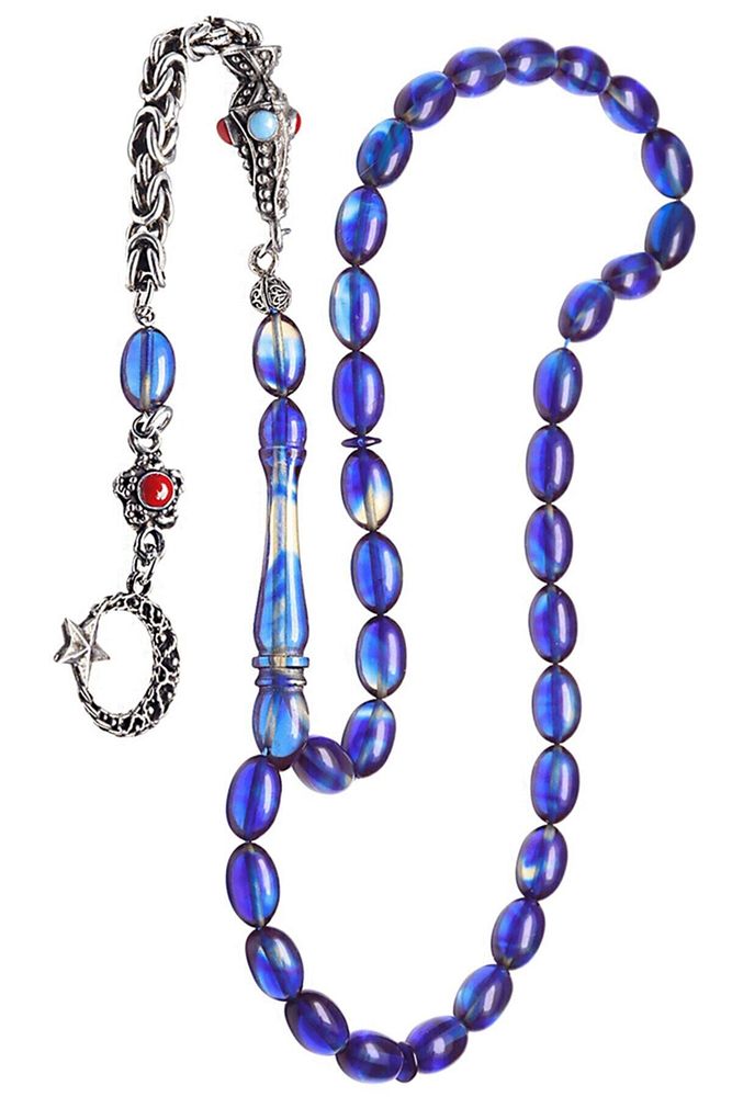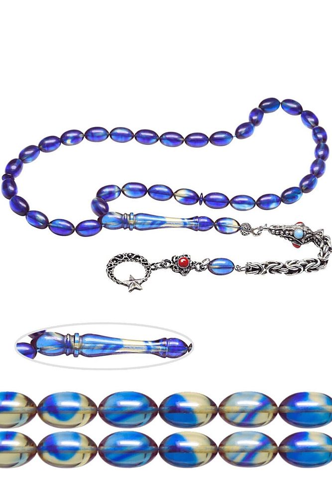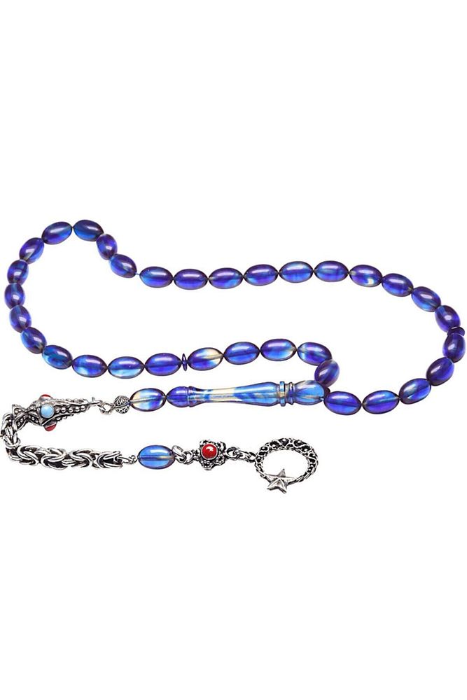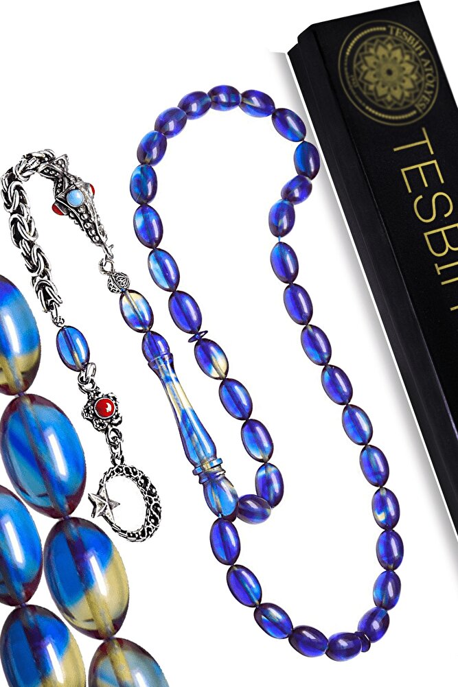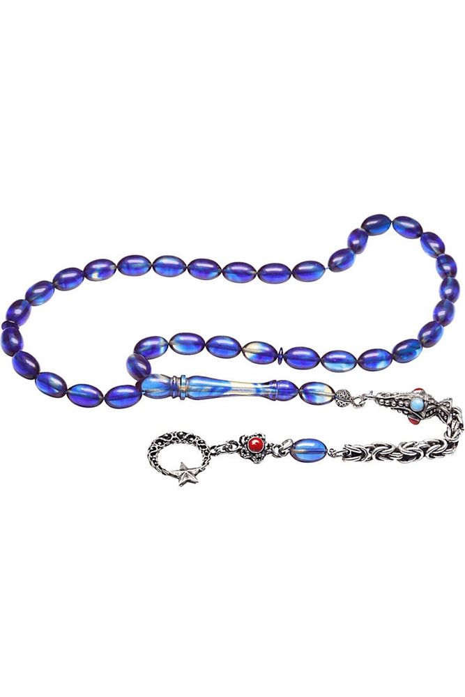 Ürün ya da Doğal Taş Açıklaması (Ağrı Kesici, Sinir Stres ve Bereket Taşı) Ateş kehribar tesbih modelleri, ''Tesbih Atölyesi'' Atölyelerinde ustalarımız tarafından kuru torna işciliği ile elde özen ile tane tane işlenmektedir. Ürünlerimiz el işciliği olduğu için sınırlı sayıda üretilmektedir. Tasarımlarımızda kullandığımız reçineler Dünya'nın en kaliteli reçineleridir. Kısa bir süre içerisinde renk alır ve koku verir. Ürünleriniz orijinallik ve garanti belgesi ile gönderilir. Tasarımlarımıza üç kat cila atılmıştır. Muhteşem bir çekime sahip koleksiyonluk ve günlük çekim için ideal ürünlerdir. Bu tasarımda; Mavi hareli renkli a kalite renk alan ve koku veren kaliteli ateş kehribar reçine kullanılmıştır. Her kehribar tanesi birbirinin aynısı olmadığı için küçükte olsa farklılıklar gösterebilir. Üretildiği Malzeme; Ateş Kehribar; Ana Renk; Mavi Hareli Renk; Ağırlık; 20-30 gr; Tane Şekli; 7x11 mm; Tane Ölçüsü; Beyzi Kesim; Toplam Uzunluk; 20-30 cm; İmame ve Püskül Maddesi; Düşük Ayar Gümüş;