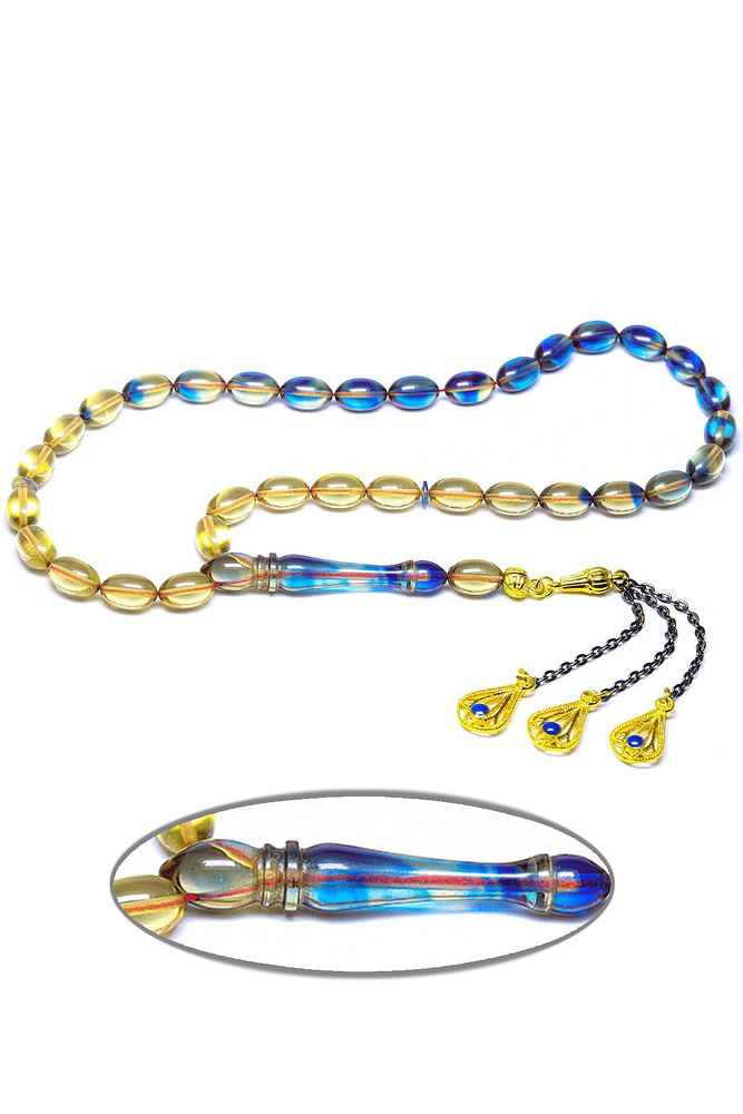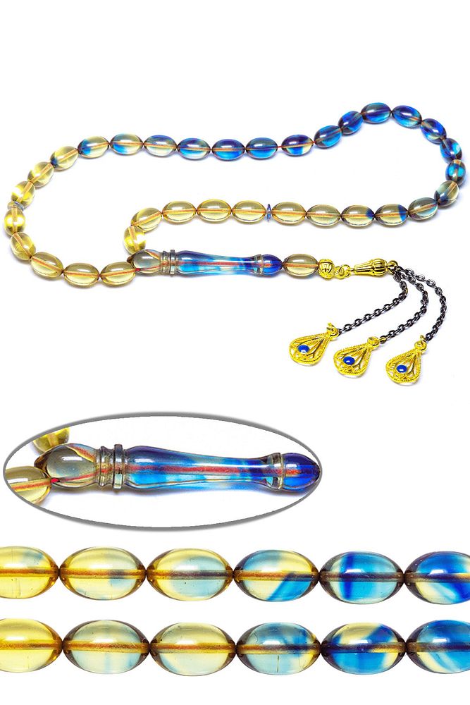 (Ağrı Kesici, Sinir Stres ve Bereket Taşı) Ateş kehribar tesbih modelleri, ''Tesbih Atölyesi'' Atölyelerinde ustalarımız tarafından kuru torna işciliği ile elde özen ile tane tane işlenmektedir. Ürünlerimiz el işciliği olduğu için sınırlı sayıda üretilmektedir. Tasarımlarımızda kullandığımız reçineler Dünya'nın en kaliteli reçineleridir. Kısa bir süre içerisinde renk alır ve koku verir. Ürünleriniz orijinallik ve garanti belgesi ile gönderilir. Tasarımlarımıza üç kat cila atılmıştır. Muhteşem bir çekime sahip koleksiyonluk ve günlük çekim için ideal ürünlerdir.; Bu tasarımda; Mavi ve şeffaf özel renk renk alan ve koku veren kaliteli ateş kehribar reçine kullanılmıştır. Her kehribar tanesi birbirinin aynısı olmadığı için küçükte olsa farklılıklar gösterebilir.; ; Üretildiği Malzeme; Ateş Kehribar; Ana Renk; Mavi ve Şeffaf Renk; Ağırlık; 20-30 gr; Tane Şekli; 7x11 mm; Tane Ölçüsü; Beyzi Kesim; Toplam Uzunluk; 20-30 cm; İmame ve Püskül Maddesi; Düşük Ayar Gümüş;