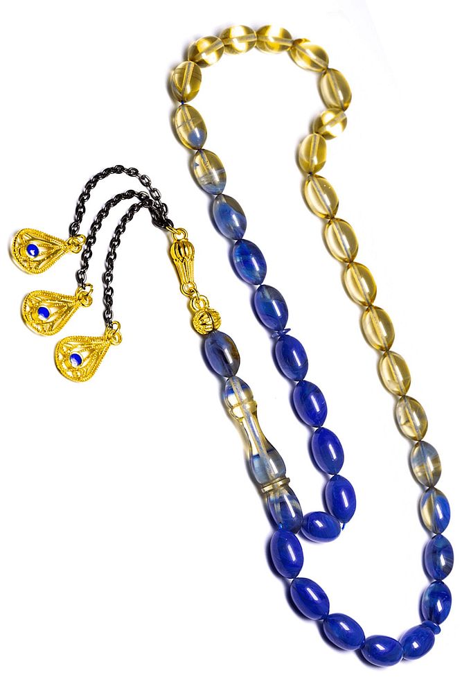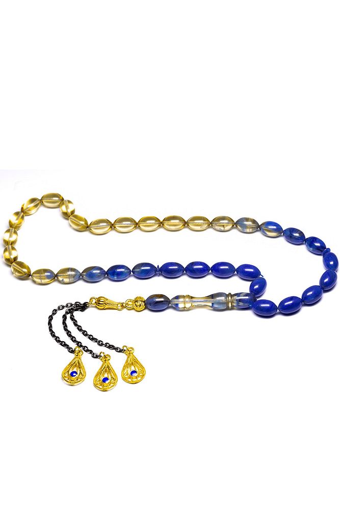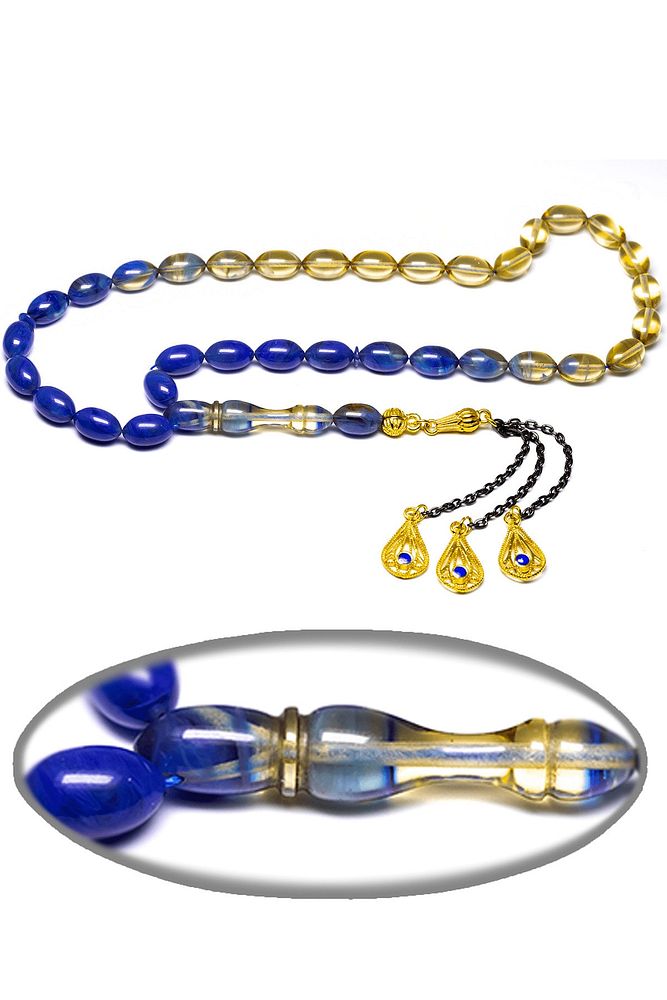 Mavi Şeffaf Renk Hüzmesi Altın Kaplama Püsküllü Ateş Kehribar Tesbih