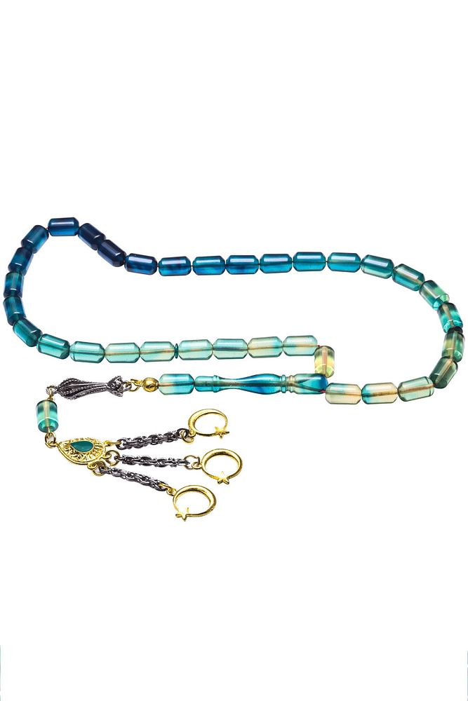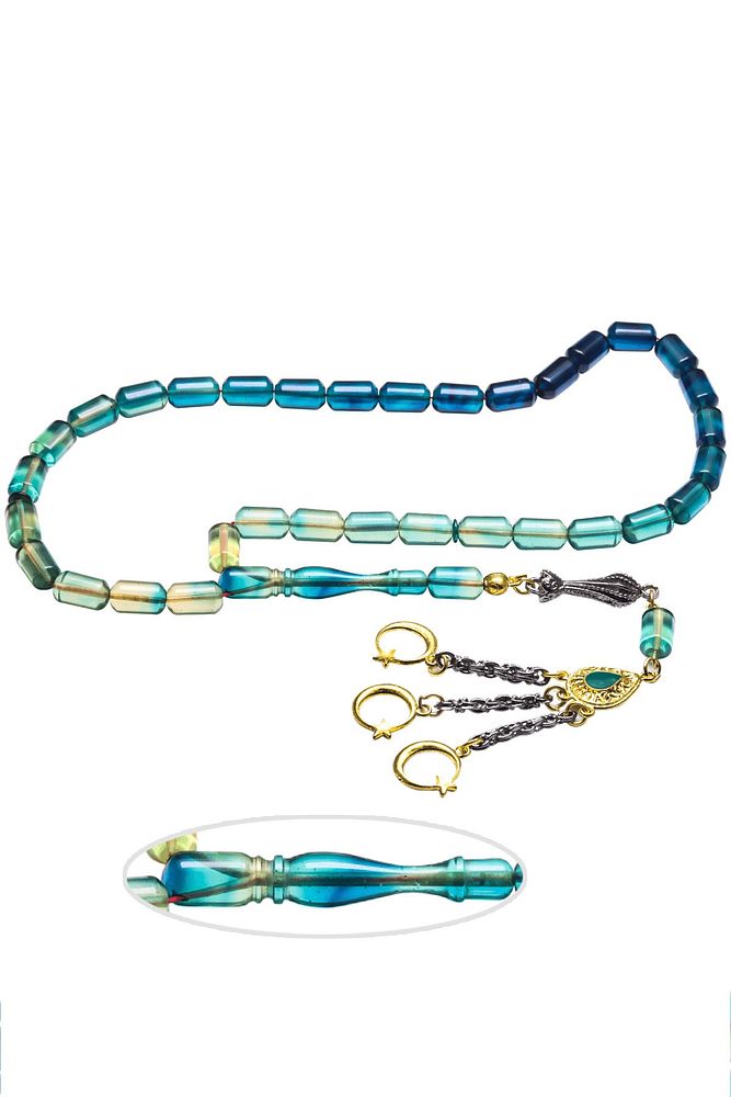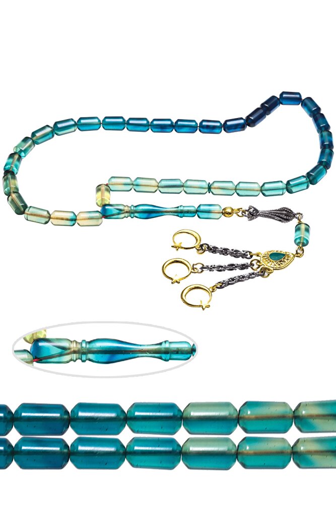 Ürün ya da Doğal Taş Açıklaması; (Ağrı Kesici, Sinir Stres ve Bereket Taşı); Ateş kehribar tesbih modelleri, ''Tesbih Atölyesi'' Atölyelerinde ustalarımız tarafından kuru torna işciliği ile elde özen ile tane tane işlenmektedir. Ürünlerimiz el işciliği olduğu için sınırlı sayıda üretilmektedir. Tasarımlarımızda kullandığımız reçineler Dünya'nın en kaliteli reçineleridir. Kısa bir süre içerisinde renk alır ve koku verir. Ürünleriniz orijinallik ve garanti belgesi ile gönderilir. Tasarımlarımıza üç kat cila atılmıştır. Muhteşem bir çekime sahip koleksiyonluk ve günlük çekim için ideal ürünlerdir.; Bu tasarımda; Şeffaf, mavi ve turkuaz renk alan ve koku veren kaliteli ateş kehribar reçine kullanılmıştır. Her kehribar tanesi birbirinin aynısı olmadığı için küçükte olsa farklılıklar gösterebilir.; Üretildiği Malzeme; Ateş Kehribar; Ana Renk; Şeffaf Mavi ve Turkuaz Renk; Ağırlık; 20-30 gr; Tane Şekli; 8x12 mm; Tane Ölçüsü; Kapsül Kesim; Toplam Uzunluk; 20-30 cm; İmame ve Püskül Maddesi; Düşük Ayar Gümüş;