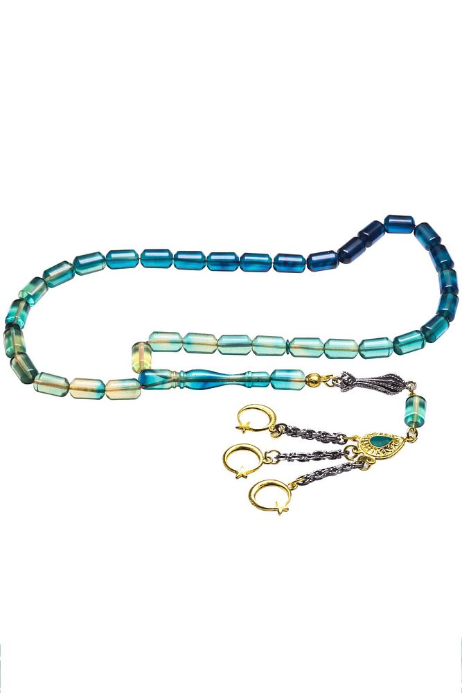 Mavi Şeffaf Renkli 24 Ayar Altın Kaplama Püsküllü Ateş Kehribar Tesbih