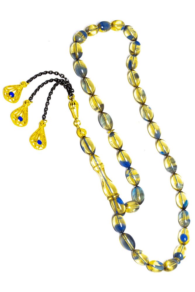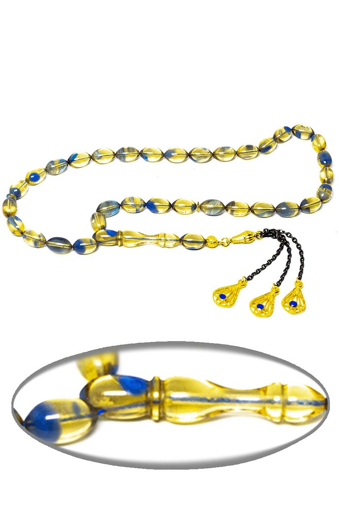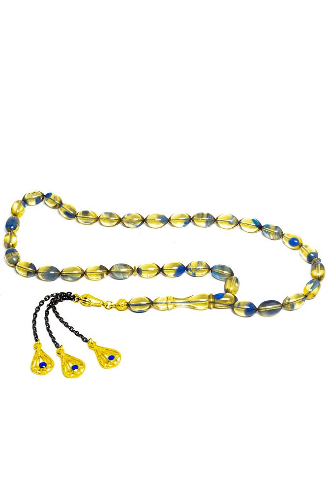 Mavi Şeffaf Renkli Beyzi Kesim Altın Kaplama Püsküllü Ateş Kehribar Tesbih