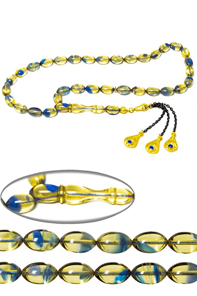 Ürün ya da Doğal Taş Açıklaması (Ağrı Kesici, Sinir Stres ve Bereket Taşı Ateş kehribar tesbih modelleri, \'\'Tesbih Atölyesi\'\' Atölyelerinde ustalarımız tarafından kuru torna işciliği ile elde özen ile tane tane işlenmektedir. Ürünlerimiz el işciliği olduğu için sınırlı sayıda üretilmektedir. Tasarımlarımızda kullandığımız reçineler Dünya\'nın en kaliteli reçineleridir. Kısa bir süre içerisinde renk alır ve koku verir. Ürünleriniz orijinallik ve garanti belgesi ile gönderilir. Tasarımlarımıza üç kat cila atılmıştır. Muhteşem bir çekime sahip koleksiyonluk ve günlük çekim için ideal ürünlerdir. Bu tasarımda; Mavi ve şeffaf özel renkli renk alan ve koku veren kaliteli ateş kehribar reçine kullanılmıştır. Her kehribar tanesi birbirinin aynısı olmadığı için küçükte olsa farklılıklar gösterebilir. Üretildiği Malzeme; Ateş Kehribar; Ana Renk; Mavi ve Şeffaf Renk; Ağırlık; 20-30 gr; Tane Şekli; 7x11 mm; Tane Ölçüsü; Beyzi Kesim; Toplam Uzunluk; 20-30 cm; İmame ve Püskül Maddesi; Düşük Ayar Gümüş;