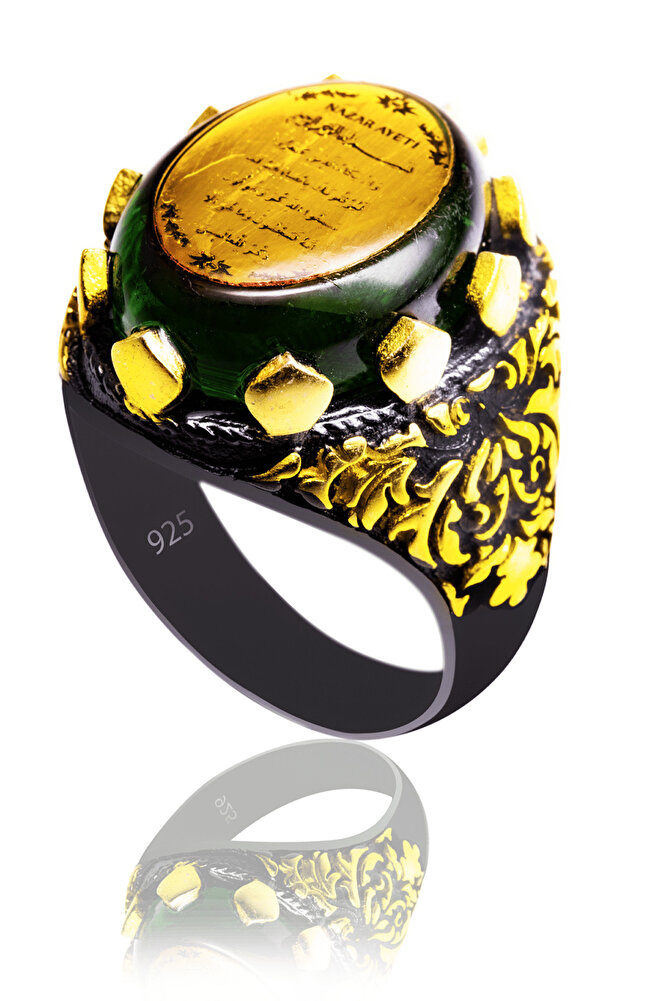 Bu tasarımda; Nazar ayeti işlemeli Yeşil Kehribar Taşı kullanılmıştır. Kasadaki desenler oyma el sanatı ile yapılmaktadır. Erkek gümüş yüzüklerimizin ölçüsünü parmağınıza göre çevrenizdeki sarrafiye ve gümüşcülere çok cüzzi 3 ile 5 TL yaptırabilirsiniz. Ürünlerimiz standart ölçü gönderilmektedir. Bu işlemi yaklaşık 5 dakika içerisinde yaptırabilirsiniz.