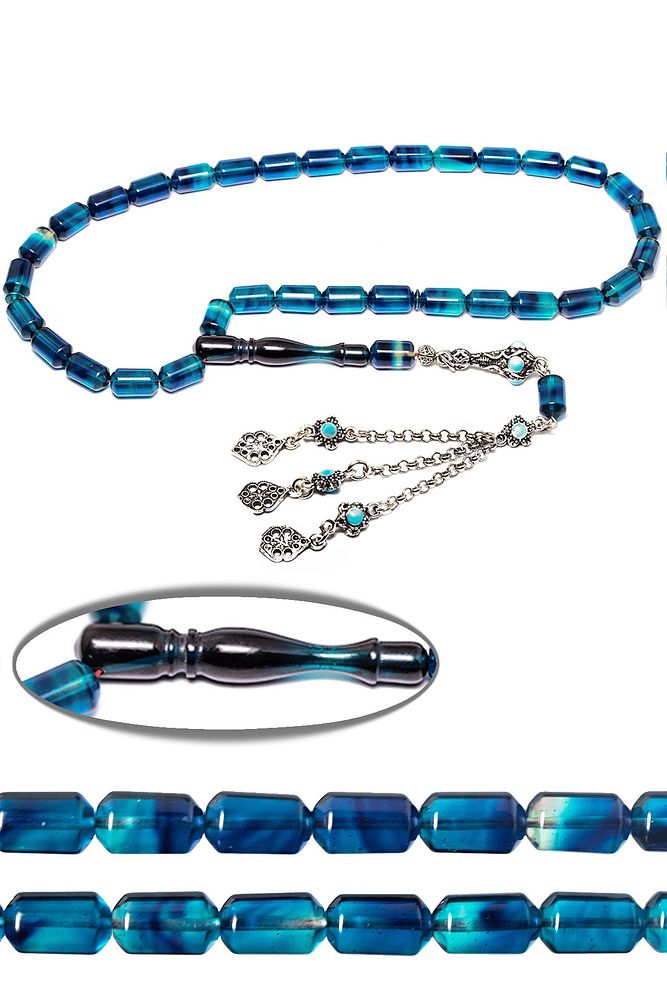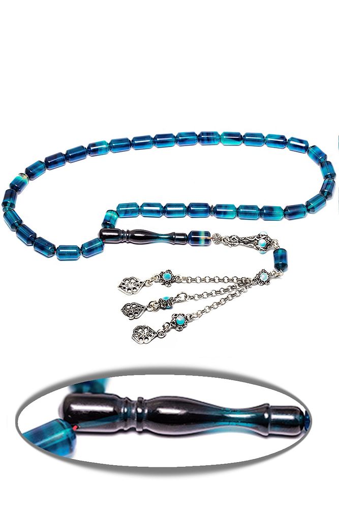Ürün ya da Doğal Taş Açıklaması (Ağrı Kesici, Sinir Stres ve Bereket Taşı) Ateş kehribar tesbih modelleri, ''Tesbih Atölyesi'' Atölyelerinde ustalarımız tarafından kuru torna işciliği ile elde özen ile tane tane işlenmektedir. Ürünlerimiz el işciliği olduğu için sınırlı sayıda üretilmektedir. Tasarımlarımızda kullandığımız reçineler Dünya'nın en kaliteli reçineleridir. Kısa bir süre içerisinde renk alır ve koku verir. Ürünleriniz orijinallik ve garanti belgesi ile gönderilir. Tasarımlarımıza üç kat cila atılmıştır. Muhteşem bir çekime sahip koleksiyonluk ve günlük çekim için ideal ürünlerdir. Bu tasarımda; Parlement mavisi renki özel şeffaf renkte renk alan ve koku veren kaliteli ateş kehribar reçine kullanılmıştır. Her kehribar tanesi birbirinin aynısı olmadığı için küçükte olsa farklılıklar gösterebilir. Üretildiği Malzemesi Ateş Kehribar Ana Renk Mavi Renk Ağırlık 20-30 gr Tane Şekli 8x12 mm Tane Ölçüsü Kapsül Kesim Toplam Uzunluk 20-30 cm İmame ve Püskül Maddesi Düşük Ayar Gümüş