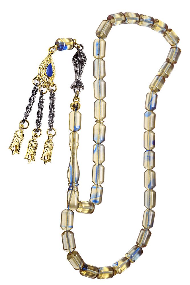 (ağrı kesici, sinir stres ve bereket taşı) ateş kehribar tesbih modelleri, ''tesbih atölyesi'' atölyelerinde ustalarımız tarafından kuru torna işciliği ile elde özen ile tane tane işlenmektedir. Ürünlerimiz el işciliği olduğu için sınırlı sayıda üretilmektedir. Tasarımlarımızda kullandığımız reçineler dünya'nın en kaliteli reçineleridir. Kısa bir süre içerisinde renk alır ve koku verir. Ürünleriniz orijinallik ve garanti belgesi ile gönderilir. Tasarımlarımıza üç kat cila atılmıştır. Muhteşem bir çekime sahip koleksiyonluk ve günlük çekim için ideal ürünlerdir. Bu tasarımda; şeffaf mavi renkli özel renk alan ve koku veren kaliteli ateş kehribar reçine kullanılmıştır. Her kehribar tanesi birbirinin aynısı olmadığı için küçükte olsa farklılıklar gösterebilir. Üretildiği malzeme; ateş kehribar; ana renk; şeffaf mavi renk; ağırlık; 20-30 gr; tane şekli; 8x12 mm; tane ölçüsü; kapsül kesim; toplam uzunluk; 20-30 cm; imame ve püskül maddesi; düşük ayar gümüş;
