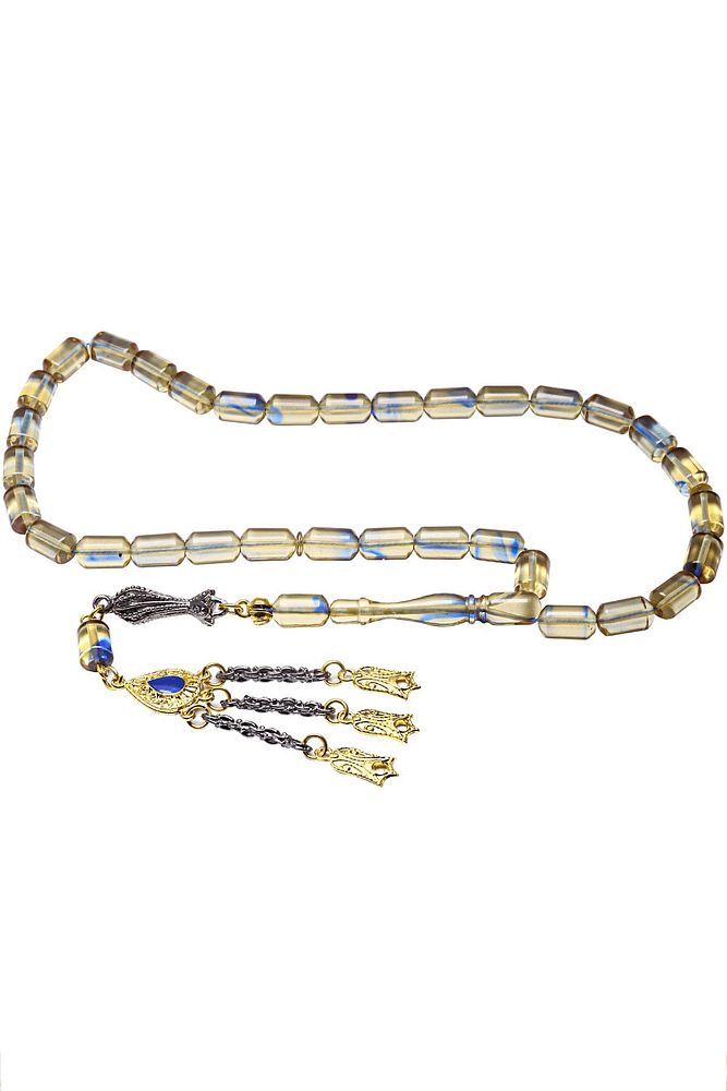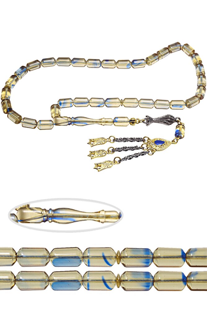 Şeffaf Mavi Hareli Altın Kaplama Püsküllü Ateş Kehribar Tesbih