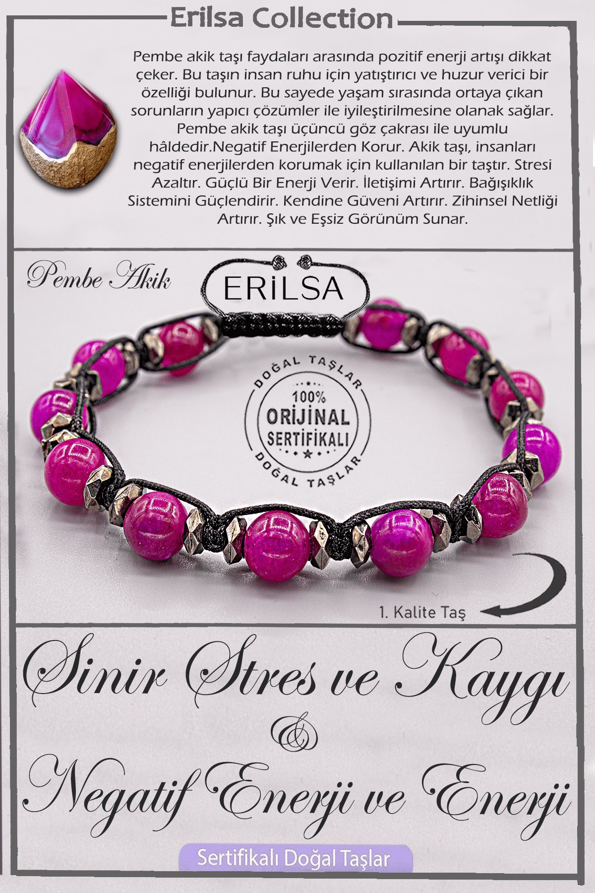 Sertifikalı AAA+ Kalite Doğal Pembe Akik Taşı Bileklik - Stresi Sil Sevgi ve Huzuru Hisset