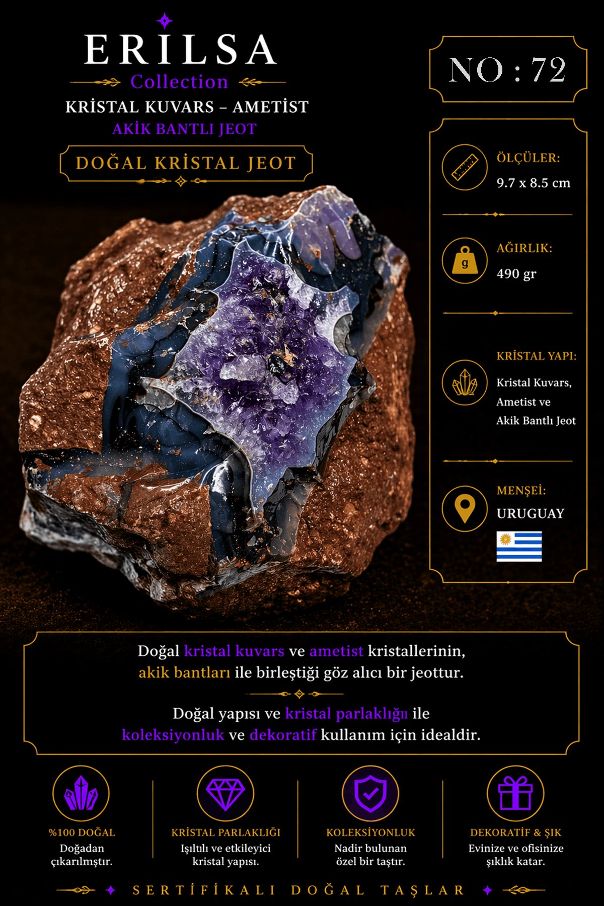 Sertifikalı Doğal Ametist Jeodu Akik Bantlı Kristal Kuvars Büyük Boy Uruguay Nadir NO72
