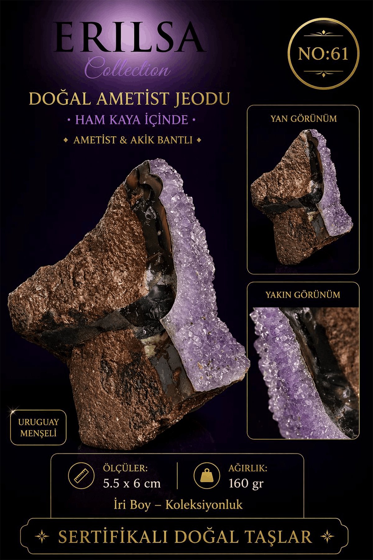 Sertifikalı Doğal Ametist Jeodu Akik Bantlı Kristal Kuvars Ham Kaya NO61