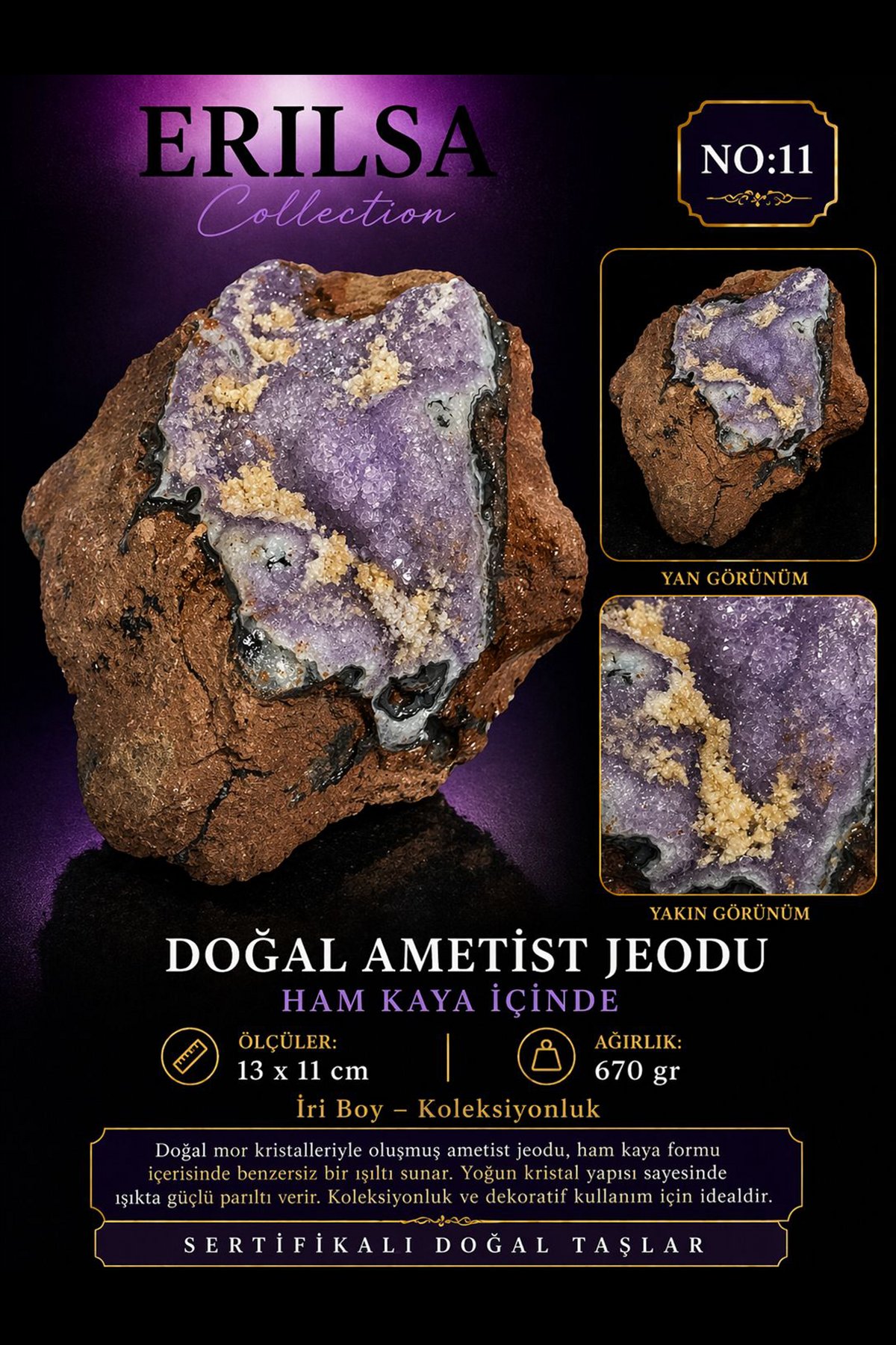 Doğal ametist jeodu, ham kaya formu içerisinde gelişmiş mor kristalleriyle dikkat çeken özel bir doğal taş kütle ürünüdür. Yüzeyinde bulunan kristal yapılar ışık altında yoğun ve göz alıcı bir parlaklık oluşturur