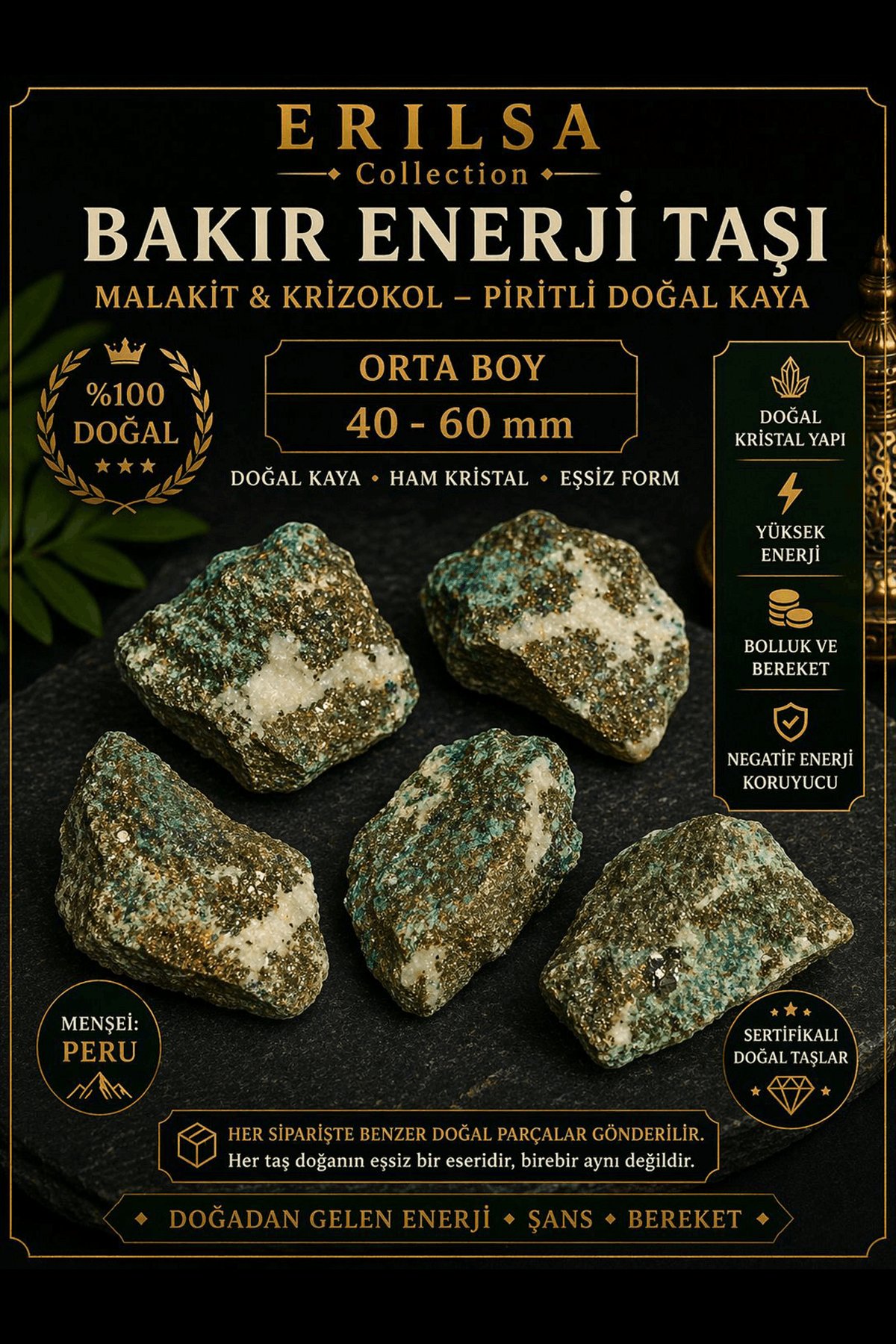 40-60 mm ölçülerindeki bakır enerji taşı, malakit ve krizokol minerallerinin pirit ile birleşmesi sonucu oluşan doğal ve güçlü bir taş formudur. Canlı yeşil tonlar, turkuaz geçişler ve piritin metalik parıltısı sayesinde oldukça zengin bir görünüme sahiptir