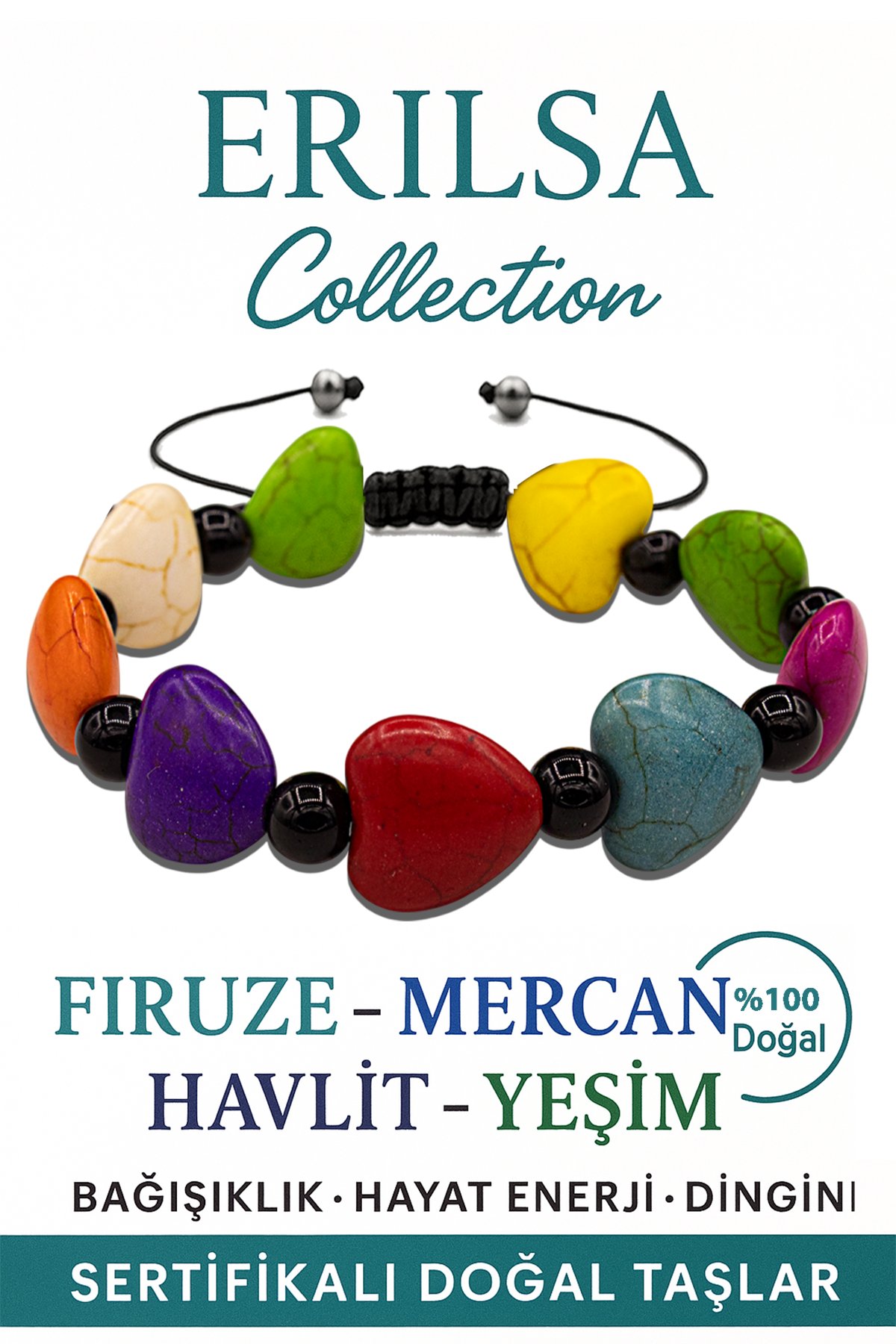 Kırmızı mercan cesaret ve canlılık katarken, firuze ruhsal iyileşmeyi hızlandırır; yeşim içsel uyum ve denge sunar, çeroit ise negatif enerjileri uzaklaştırmaya yardımcı olur. Kalp kesim detaylarıyla sofistike bir görünüm kazanan bu bileklik, sevdiklerinize anlamlı ve etkileyici bir hediye seçeneği sunar. Erilsa Collection güvencesiyle.