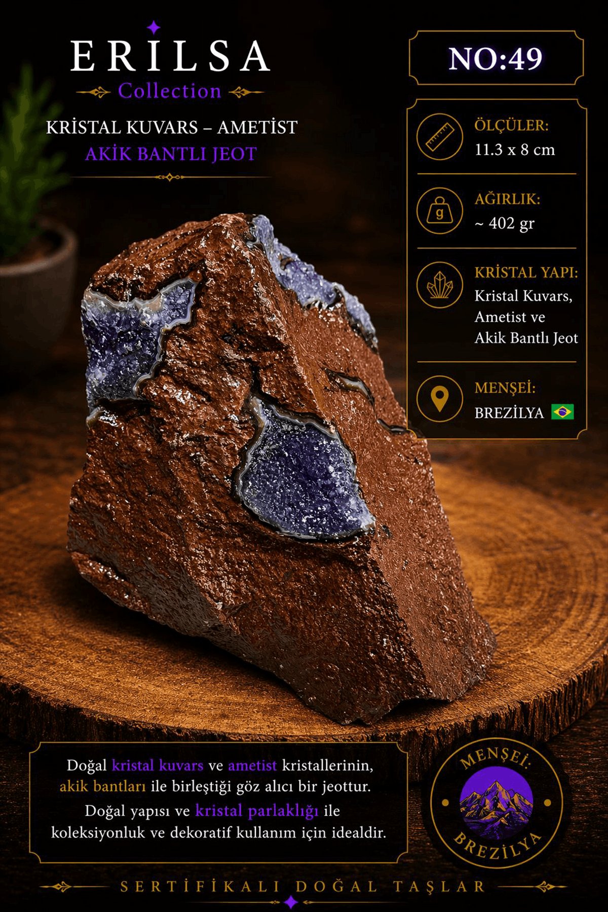 Sertifikalı Kristal Kuvars Ametist Akik Bantlı Jeot Dekoratif Koleksiyonluk NO49