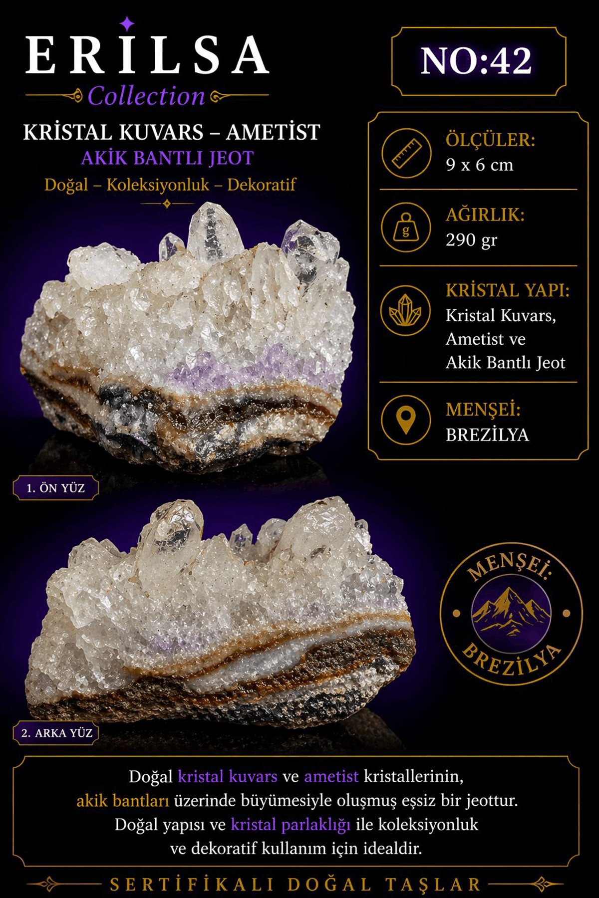 Sertifikalı Kristal Kuvars Ametist Akik Bantlı Jeot Doğal Dekoratif Koleksiyonluk NO42
