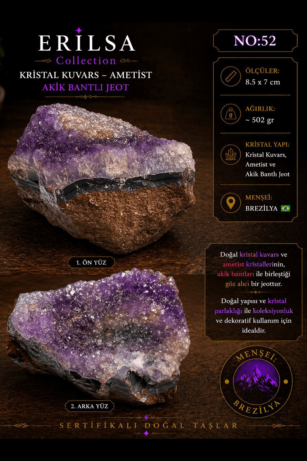 Sertifikalı Kristal Kuvars Ametist Akik Bantlı Jeot İri Kristalli Doğal Taş NO52