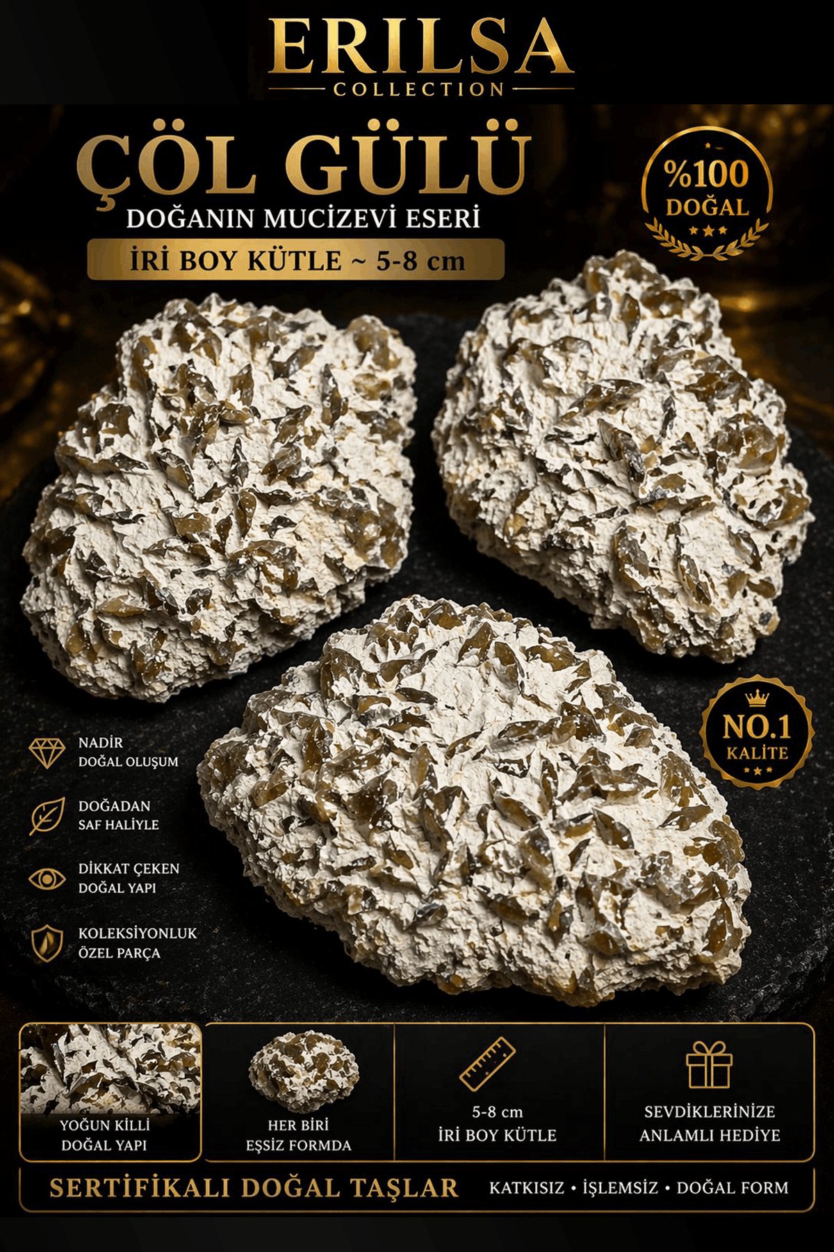 Çöl gülü taşı doğal kristal katmanlı yapısı ile dikkat çeken taşlardan biridir. Bu ürün 5-8 cm aralığında iri boy taşlardan oluşur. Toplu satış ürünüdür ve her siparişte benzer taşlar arasından seçilerek gönderilir. Doğal oluşum olduğu için her parça kendine özgüdür. Tunus sahra çölünden elde edilen bu taşlar ham ve işlenmemiş formdadır. Koleksiyonluk taş olarak tercih edilebilir aynı zamanda dekoratif amaçlı kullanım için de uygundur. Sertifikalı doğal taş kategorisindedir