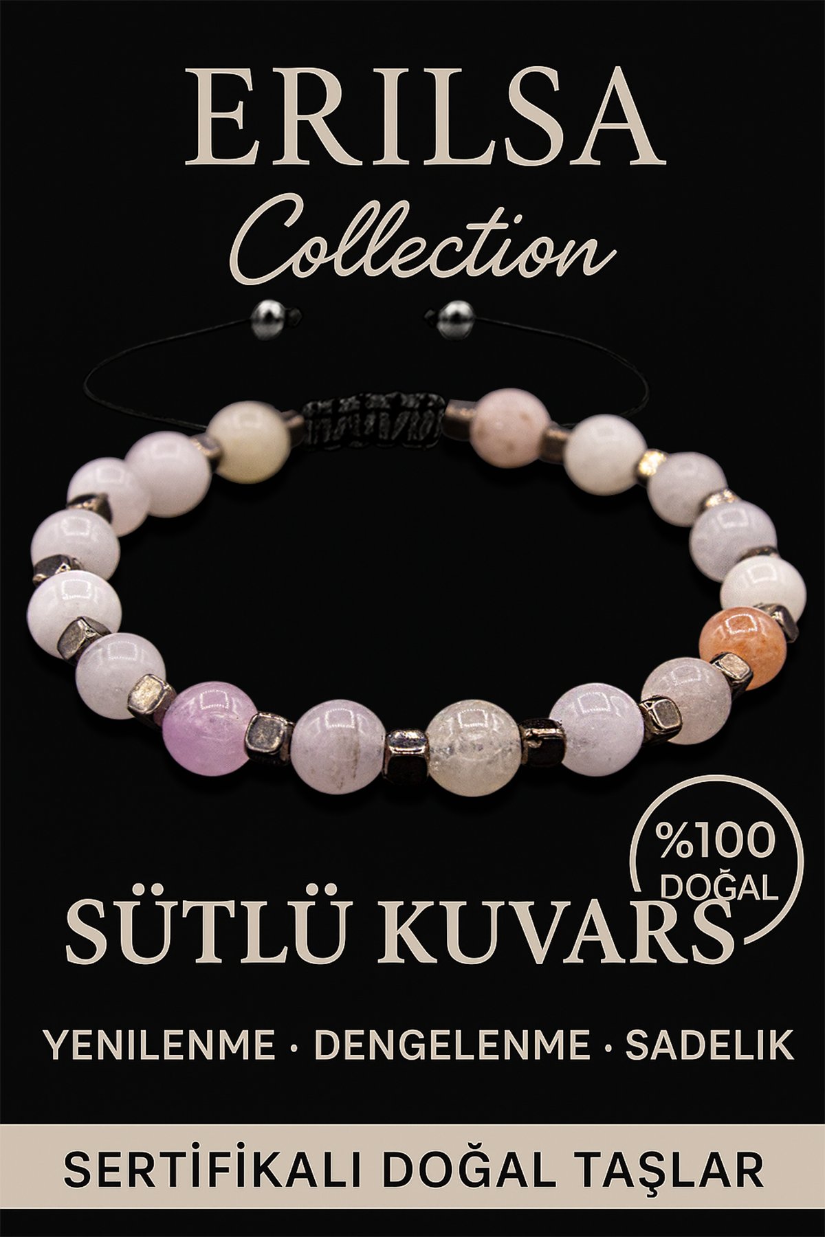 Sertifikalı, %100 doğal 6mm Terahertz ve Sütlü Kuvars taşlarından oluşur. El işçiliğiyle hazırlanmış, zarif ve enerji odaklı bir bileklik formundadır.