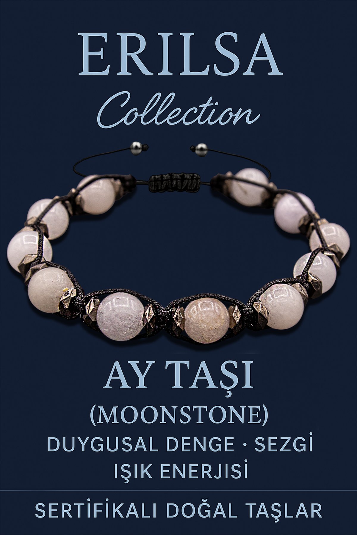 Ay taşının inci beyazı ve hafif yansımalı dokusu, Terahertz’in koyu metalik gri rengiyle şık bir kontrast oluşturur. 8 mm taşların dolgun yapısı bilekte güçlü, zarif ve dikkat çekici bir enerji alanı sağlar.