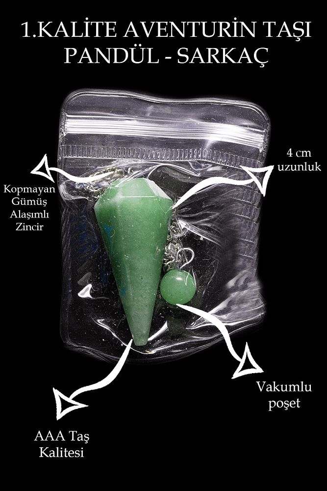 Enerji çalışmalarında kullanılan özel bir üründür. Kolye değildir.; Doğal taş: Aventurin; Ölçüleri: Ortalama 40x18 mm.; Ağırlık: Ortalama 10-12 gr.; Zincir: Ortalama 15-20 cm. uzunluğunda gümüş alaşımlı zincir fiyata dahildir.; Paket İçeriği: Ürün, sarkaç kullanım rehberi, hazırlanmış orijinallik garanti belgesi, özel kadife kesesi ile hasar almayacak şekilde gönderilir.; Orijinal doğal taşların yanında estetik olarak tamamlayıcı metal aksesuarlar kullanılmıştır.; Orijinal olan bu taşlar doğal yapıları gereği resimdeki ile farklılık gösterebilir.; Ölçüleri belirtilenle yaklaşık aynıdır fakat çizgileri farklıdır. Bu bir hata değil aksine ürünün fabrikasyon ürün olmadığının, gerçek doğal taş olduğunun göstergesidir.;