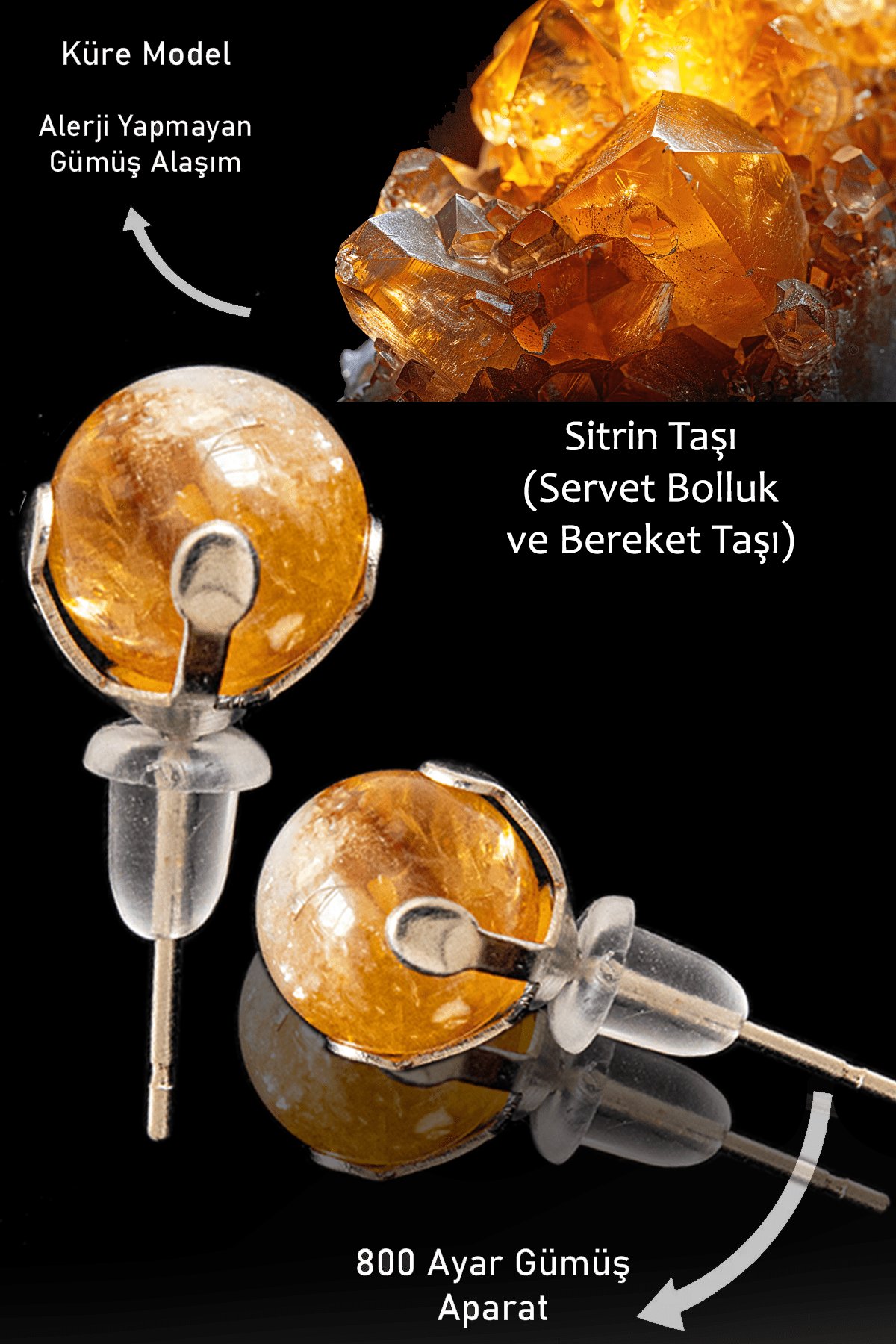 Bu tasarımımızda; %100 Doğal Sitrin Taşı kullanılmıştır.