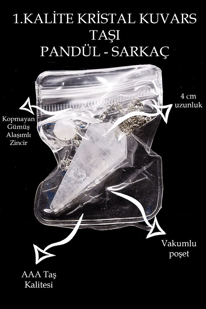 Enerji çalışmalarında kullanılan özel bir üründür. Kolye değildir.; Doğal taş: Kristal Kuvars; Ölçüleri: Ortalama 40x18 mm.; Ağırlık: Ortalama 10-12 gr.; Zincir: Ortalama 15-20 cm. uzunluğunda metal zincir fiyata dahildir.; Paket İçeriği: Ürün, sarkaç kullanım rehberi, adınıza kesilmiş fatura, adınıza hazırlanmış orijinallik garanti belgesi, özel metal kutusu ile hasar almayacak şekilde gönderilir.; Orijinal doğal taşların yanında estetik olarak tamamlayıcı metal aksesuarlar kullanılmıştır.; Orijinal olan bu taşlar doğal yapıları gereği resimdeki ile farklılık gösterebilir.; Ölçüleri belirtilenle yaklaşık aynıdır fakat çizgileri farklıdır. Bu bir hata değil aksine ürünün fabrikasyon ürün olmadığının, gerçek doğal taş olduğunun göstergesidir.;