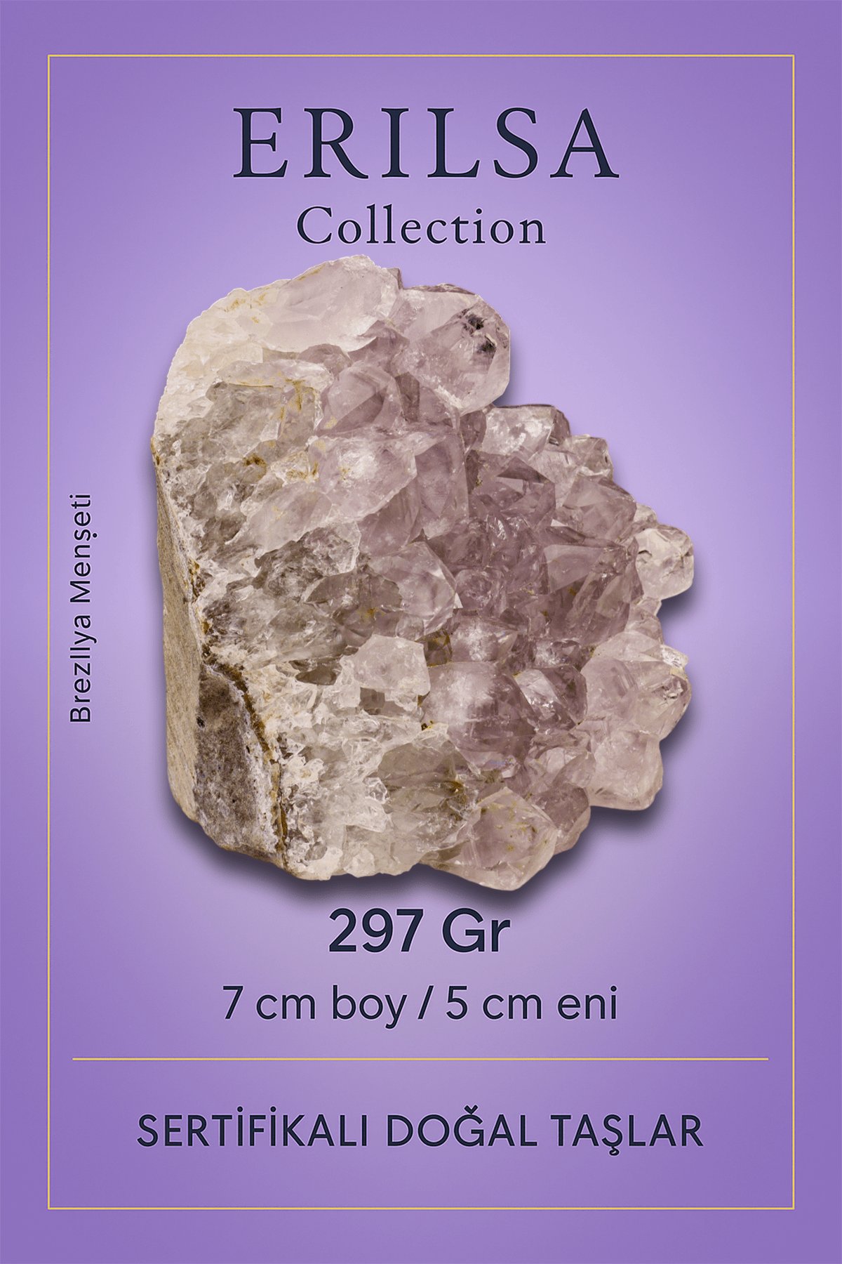 Brezilya menşeili bu açık tonlu ametist taşı, 297 gram ağırlığında olup 7 cm boy ve 5 cm enindedir. Kristal yapısı oldukça homojen, açık lavanta-mor tonlarında ve hafif saydamdır. Görsel sadeliğiyle hem dekoratif kullanım hem de koleksiyon amacıyla tercih edilebilir. Taş tamamen ham ve işlenmemiş formda sunulmaktadır.