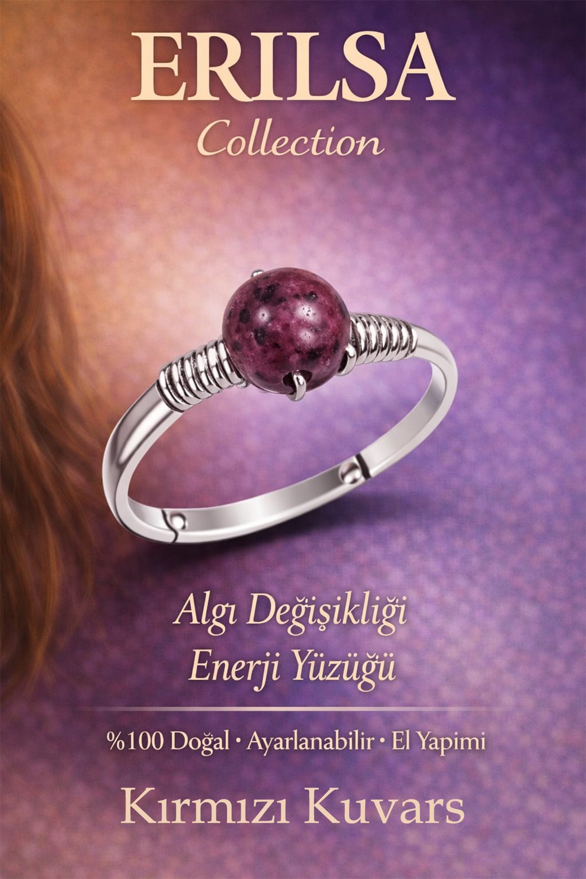 Kırmızı Kuvars taşı algısal farkındalık ve içsel uyanıklık enerjisiyle bilinir. Algı değişikliği, çevresel hassasiyet ve zihinsel dalgalanma hissi yaşayan kişiler tarafından tercih edilen taşlar arasında yer alır. Enerji çalışmalarında kişinin çevresini daha net algılamasına ve zihinsel dengeyi yeniden kurmasına yardımcı olduğu düşünülür. Ayarlanabilir ince model yüzük, bakır üzerine gümüş kaplama olarak üretilmiştir. Bakırın enerji taşıma kapasitesi sayesinde taşın frekansı bedene daha etkin şekilde aktarılır. Koç, Yay ve Akrep burçlarının güçlü sezgisel yapısıyla uyumludur. Günlük kullanım için hafif ve estetik bir tasarıma sahiptir. Doğal taş olması sebebiyle her ürün kendine özgüdür.
