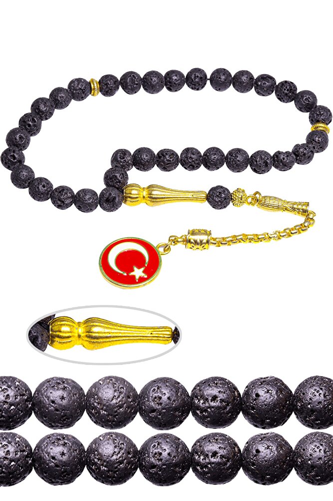 Sertifikalı Altın Kaplama Kararmaz Püskül Yanardağ Tüfü Doğal Lav Taşı Tesbih