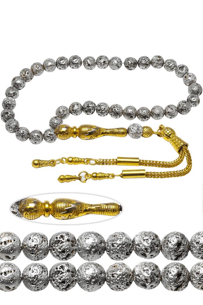 Ürün ya da Doğal Taş Açıklaması (Volkanik Enerji Yanardağ Taşı) Lav taşı tesbih modelleri, ''Tesbih Atölyesi'' Atölyelerinde ustalarımız tarafından kuru torna işciliği ile elde özen ile tane tane işlenmektedir. Ürünlerimiz el işciliği olduğu için sınırlı sayıda üretilmektedir. Tasarımlarımızda kullandığımız taşlar Dünya'nın en kaliteli doğal taşlarını ithal etmekteyiz. Tasarımlarımızda kullandığımız doğal taşların hiç biri birbirinin aynısı olmadığı için küçükte olsa farklılık gösterebilir. Yanardağların patlaması sonucu elde edilen lav taşlarından üretilmektedir. Bu tasarımda; Gümüş renkli doğal volkanik yanardağ tüfü lav taşı ve Gümüş renkli sarı 24 ayar altın kaplama imame ve püskül seti kullanılmıştır. Çift kaplama atıldığı için renk atmaz ve kararmaz bir yapıya sahiptir. Yedek ip ile gönderim sağlanır. Üretildiği Taş; Lav Taşı; Ana Renk; Gümüş Renk; Ağırlık; 20-30 gr; Tane Şekli; 8x8 mm; Tane Ölçüsü; Küre Kesim; Toplam Uzunluk; 20-30 cm; İmame ve Püskül Maddesi; Düşük Ayar Gümüş;