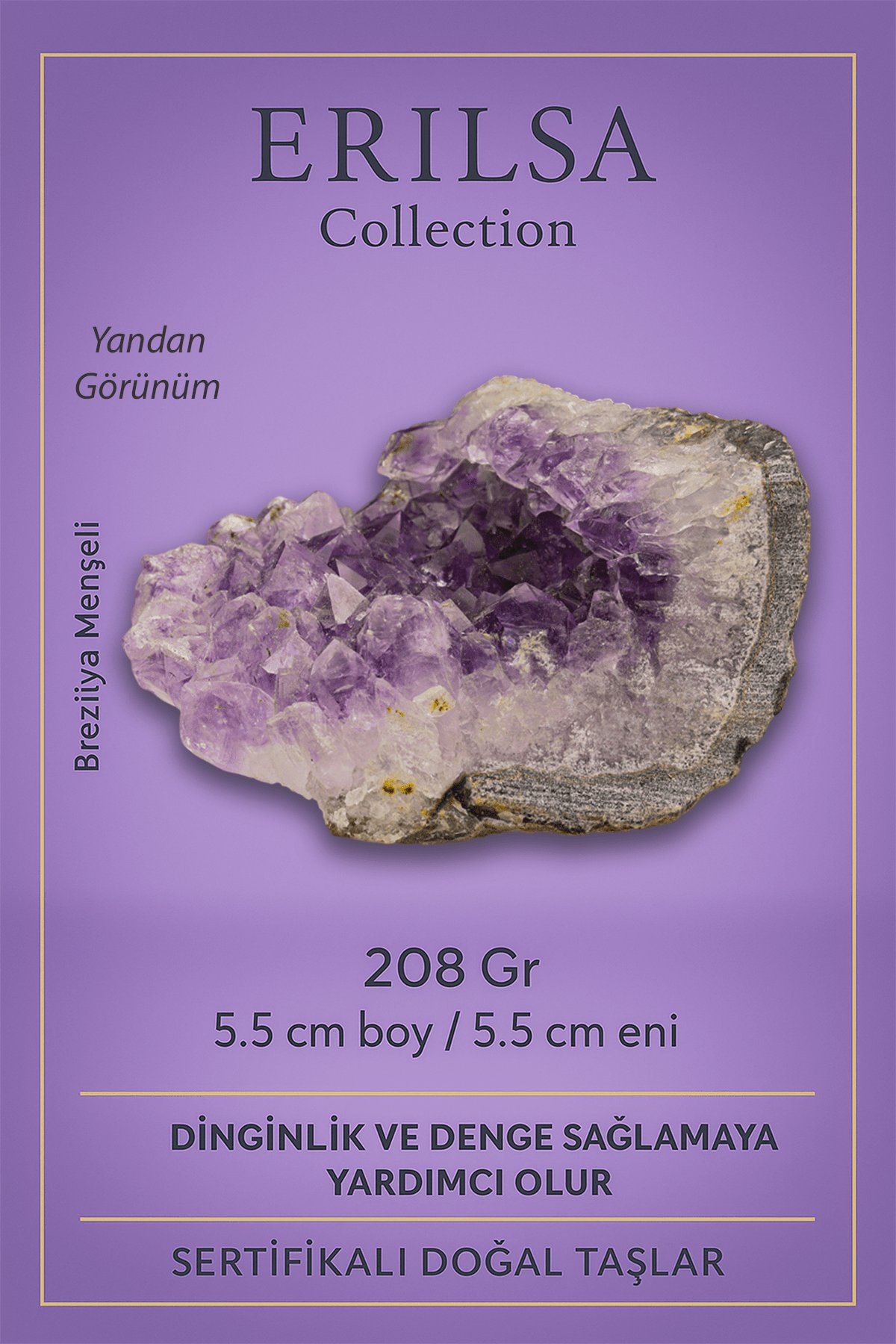 Brezilya menşeili bu özel ametist taşı, 208 gram ağırlığında ve 5.5 × 5.5 cm ölçülerindedir. Yüzeyinde doğal kristal uçlar belirgin şekilde yer almakta olup, taşı tamamen ham ve işlenmemiş formda sunmaktadır. Estetik görselliğiyle dikkat çeken bu taş, “Dinginlik ve denge sağlamaya yardımcı olur” etkisiyle ön plana çıkar. Hem şifa çalışmaları hem dekoratif koleksiyonlarda eşsiz bir yer edinir.
