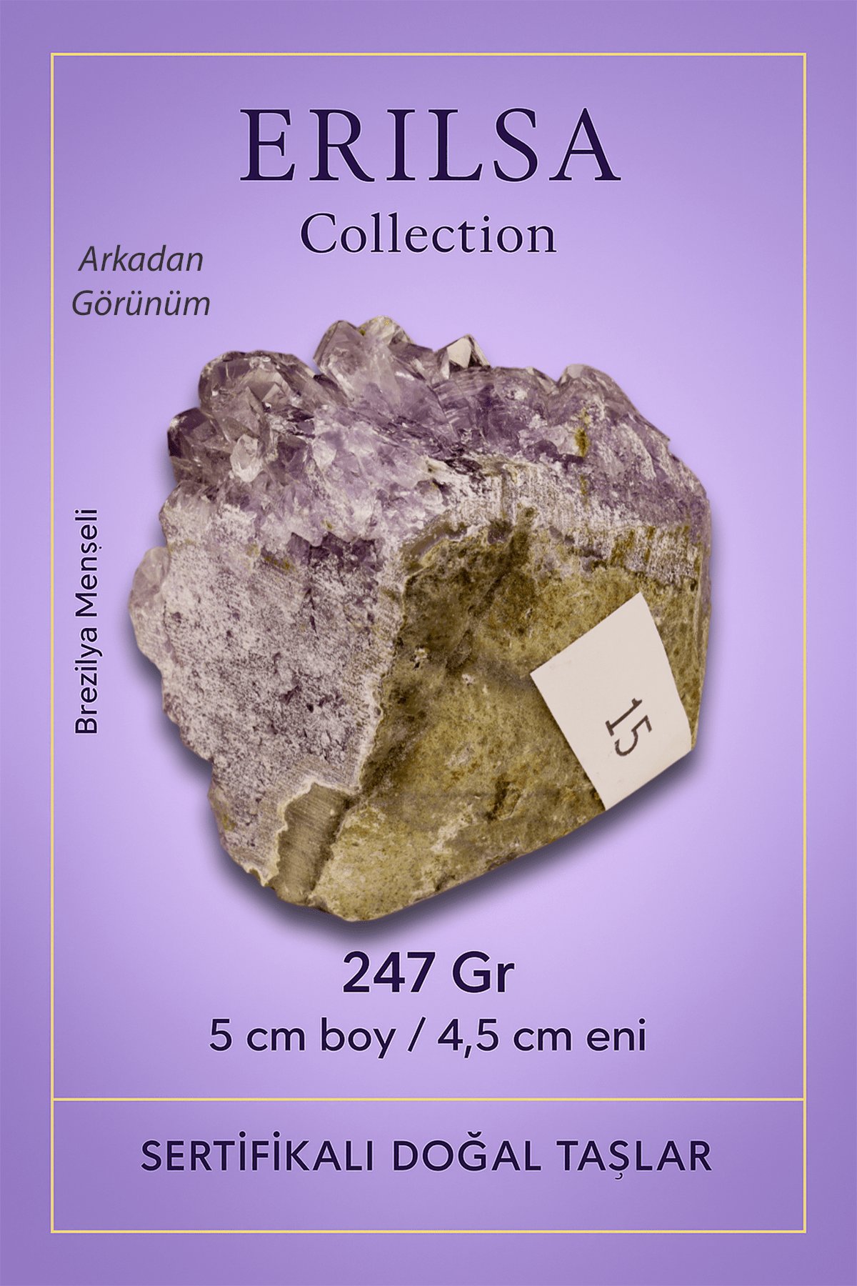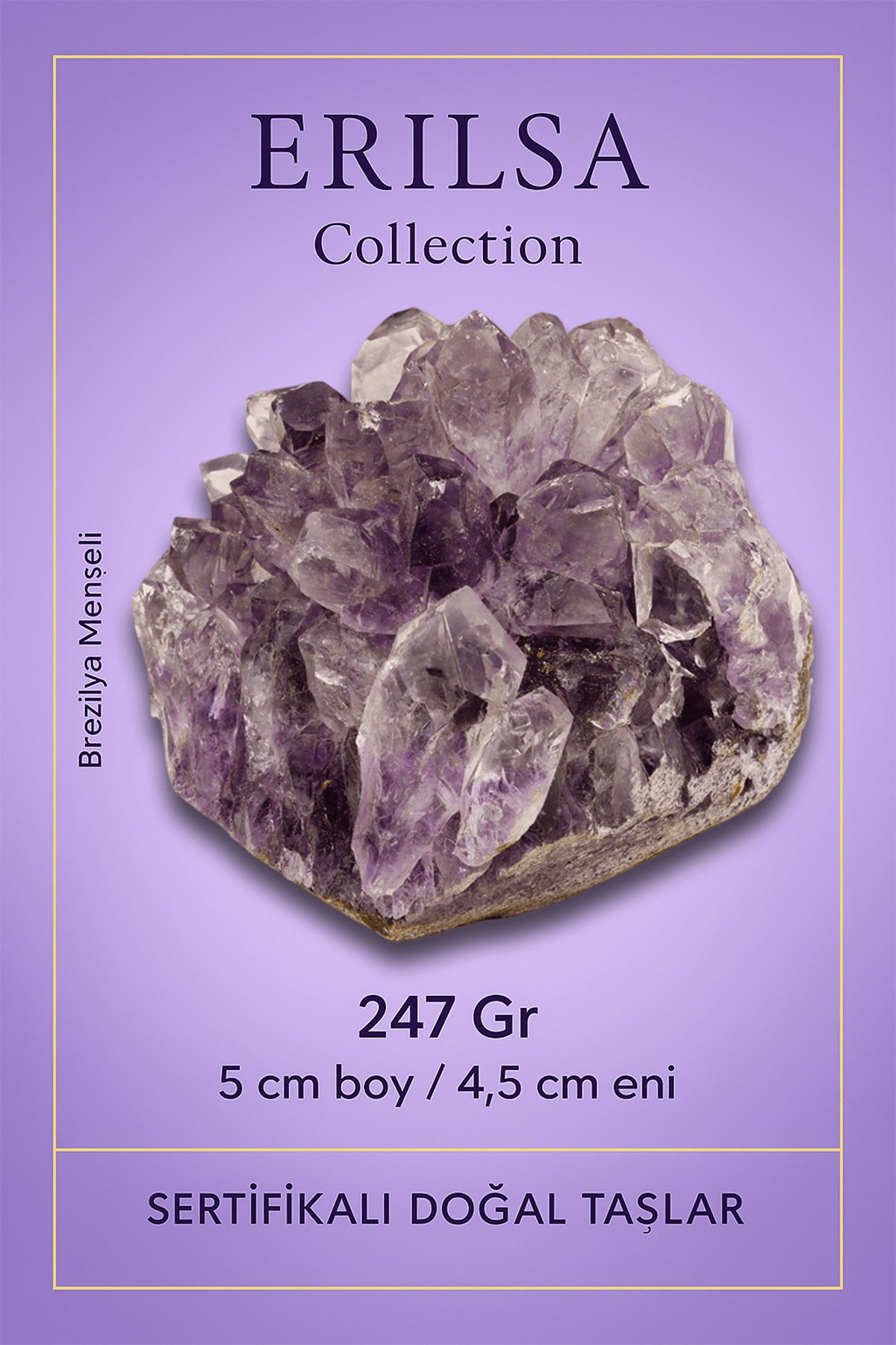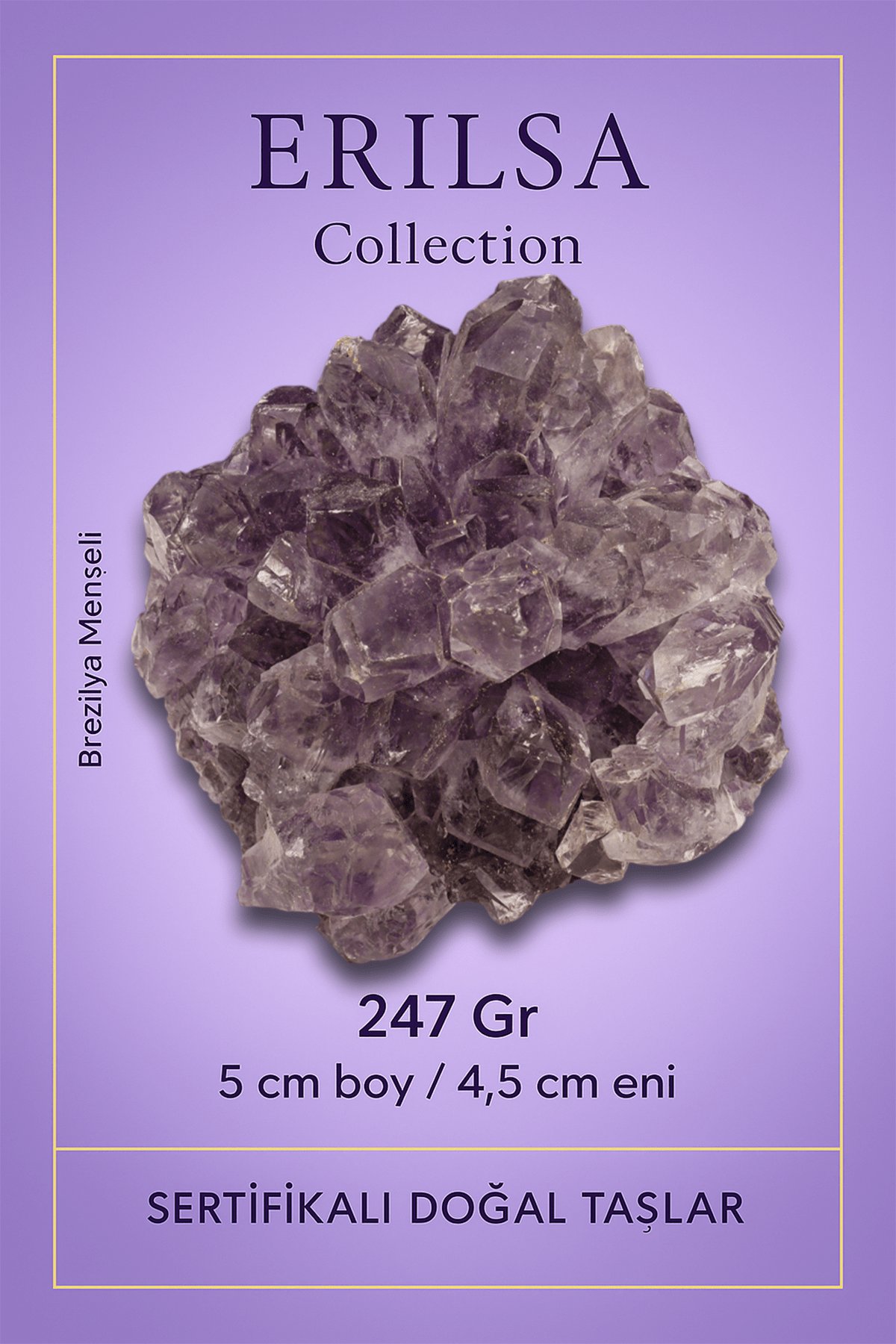 Kompakt ve güçlü kristal yapısıyla öne çıkan bu Brezilya menşeili ametist taşı, 247 gram ağırlığında olup 5 cm boy ve 4,5 cm enindedir. Yüzeyinde belirgin ve yoğun kristal çıkıntıları bulunan bu taş, tamamen ham ve işlenmemiş formda sunulmaktadır. Koyu mor tonları ve ışıkla parlayan doğal yapısıyla koleksiyonluk nitelik taşır.