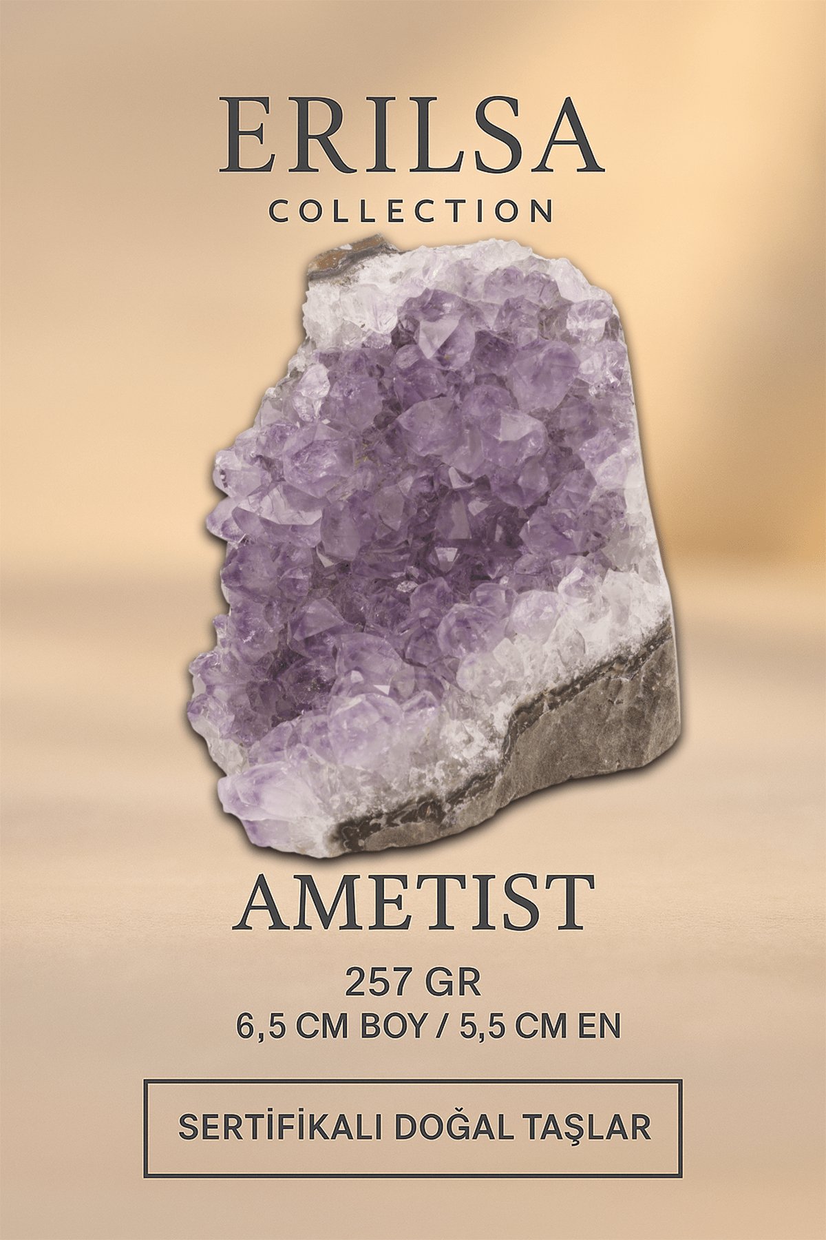257 gram ağırlığındaki bu sertifikalı doğal ametist taşı; koleksiyonluk bir parça olmakla birlikte, sevdiklerinize anlamlı bir hediye olarak da değerlendirilebilir. Her biri eşsiz olan bu taşlar, doğal formları bozulmadan özenle seçilmektedir.