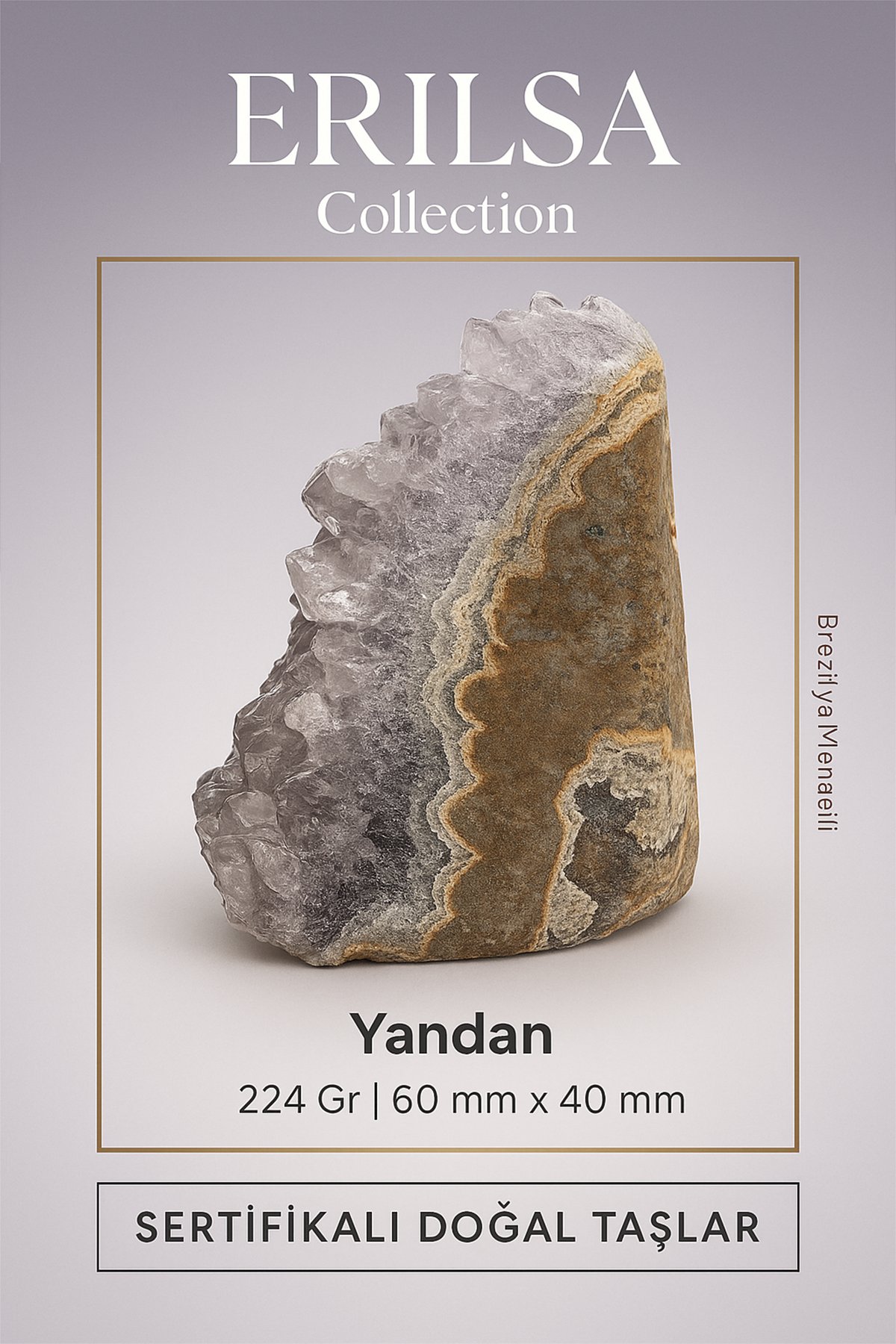 Tamamen doğal, ham ve işlenmemiş olan bu taş, Brezilya menşeili olup Erilsa Collection güvencesiyle sertifikalı olarak sunulmaktadır. Masa üstü, raf ya da kişisel köşenizde şıklık ve anlam arayanlar için eşsiz bir seçimdir.