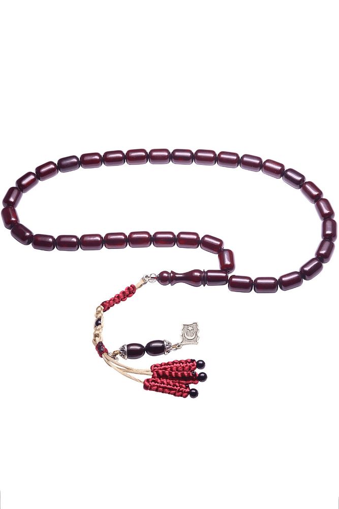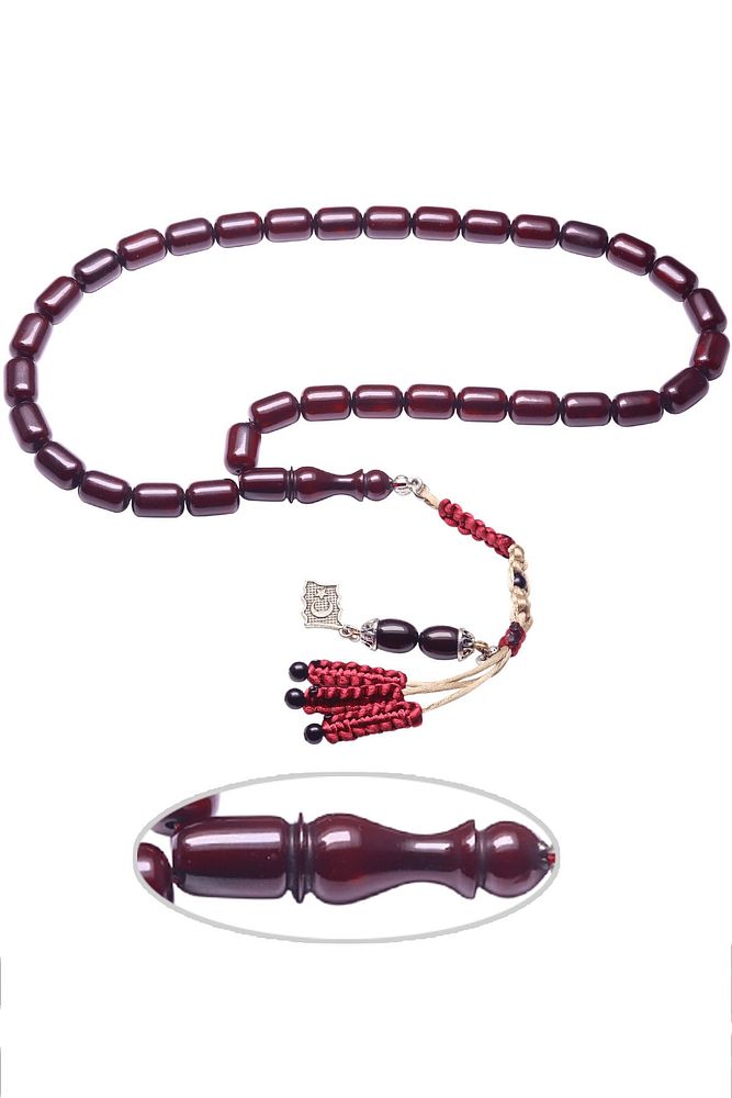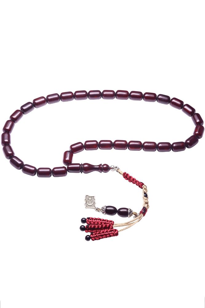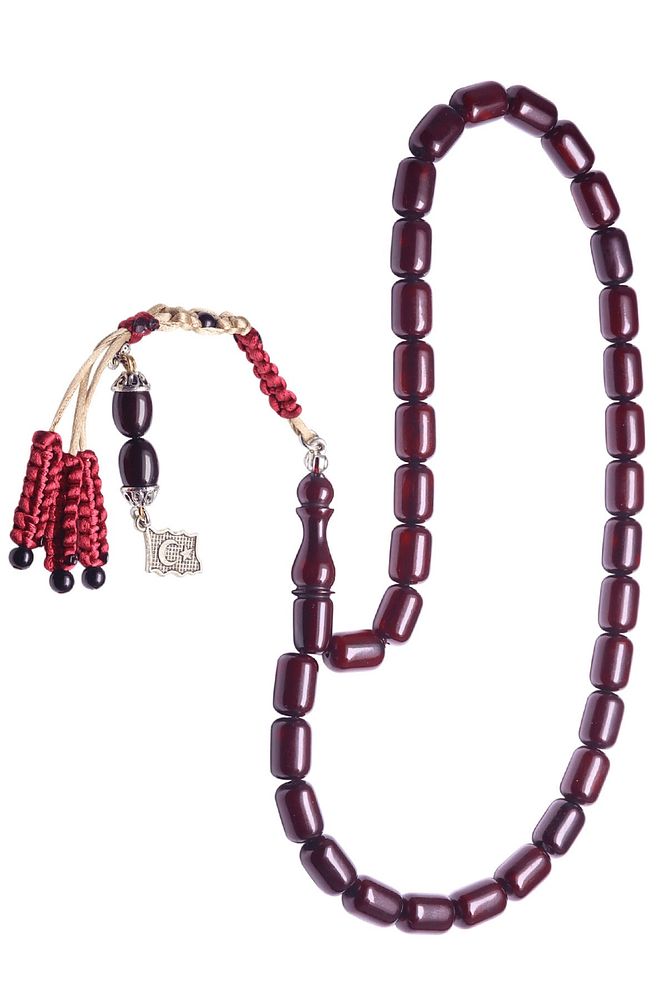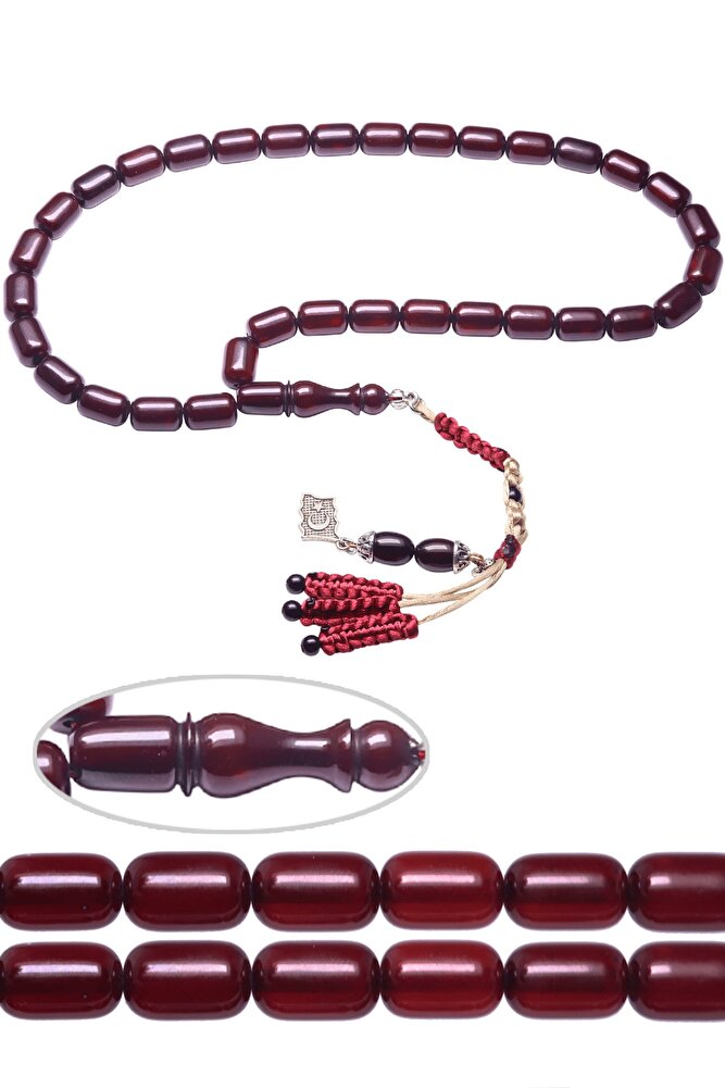 ; Ürün ya da Doğal Taş Açıklaması; ; (Baş Ağrısı Sinir ve Stres); ; Tesbih Atölyesi, Sıkma kehribar tesbih, tasarımları özel olarak usta ellerde tasarlanır. Tasarımlarımız el yapımı olup sınırlı adette üretilmektedir. Tasarımlarda kullanılan püsküller düşük ayar gümüşten imal edilir. Tasarımlarda kullanılan kehribar taneleri hareli özel kalıplardan yapılır. Yapay reçine ile üretilmektedir. Ürünlerimiz renk almakta ve koku vermektedirler. ; ; Bu tasarımda; Bordo renkli özel osmanlı benzetmesi renk alan kaliteli çubuk sıkma kehribar reçine kullanılmıştır. Her kehribar tanesi birbirinin aynısı olmadığı için küçükte olsa farklılıklar gösterebilir.; ; Üretildiği Malzeme; Sıkma Kehribar; Ana Renk; Bordo Renk; Ağırlık; 20-30 gr; Tane Şekli; 7x11 mm; Tane Ölçüsü; Kapsül Kesim; Toplam Uzunluk; 20-30 cm; İmame ve Püskül Maddesi; Düşük Ayar Gümüş;