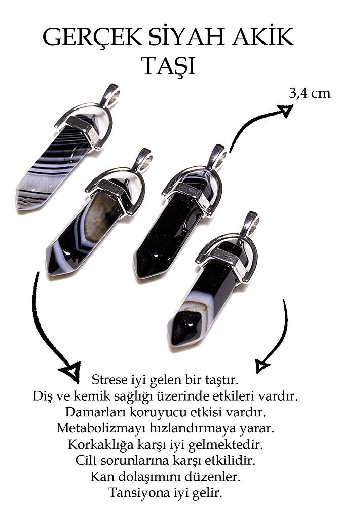 Bu doğal taş kolye tasarımımızda; Siyah akik aşı kullanılmıştır. Zincir ölçüsü 45 cm'dir. Her için uyumludur. Yetişkin ve çocuk için kullanılabilir. %100 Orijinal ve gerçek taştır. Sinirinizi stresinizi alacak, mineral açısından oldukça zengin olduğu için bulunduğu için teniniz ile temas eder etmez aradaki farkı kısa bir süre içinde hissedeceksiniz.